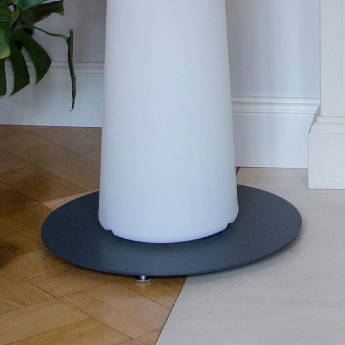 Gefertigt aus robustem Metall, überzeugt die Platte durch ihre solide Verarbeitung und hohe Standfestigkeit. Besonders praktisch ist die integrierte Höhenverstellbarkeit: Sie ermöglicht es, leichte Unebenheiten im Untergrund auszugleichen und die Stehlampe auch auf nicht vollkommen ebenen Flächen sicher auszurichten. So bleibt die No. 1 – 160 stets stabil und gerade – unabhängig davon, ob sie auf Steinboden, Holzterrasse oder Rasenfläche eingesetzt wird.