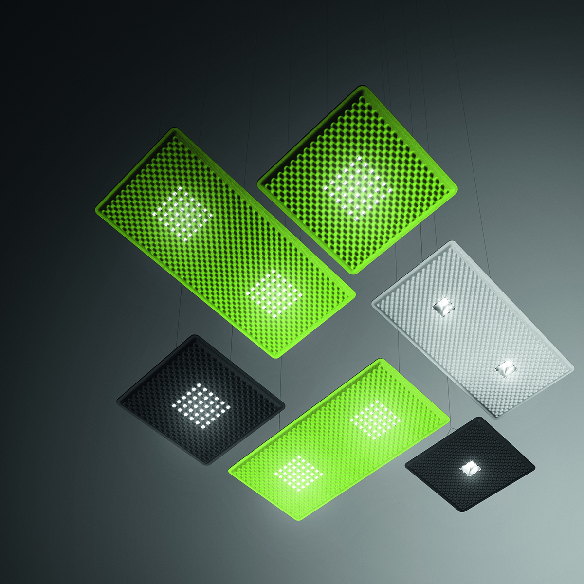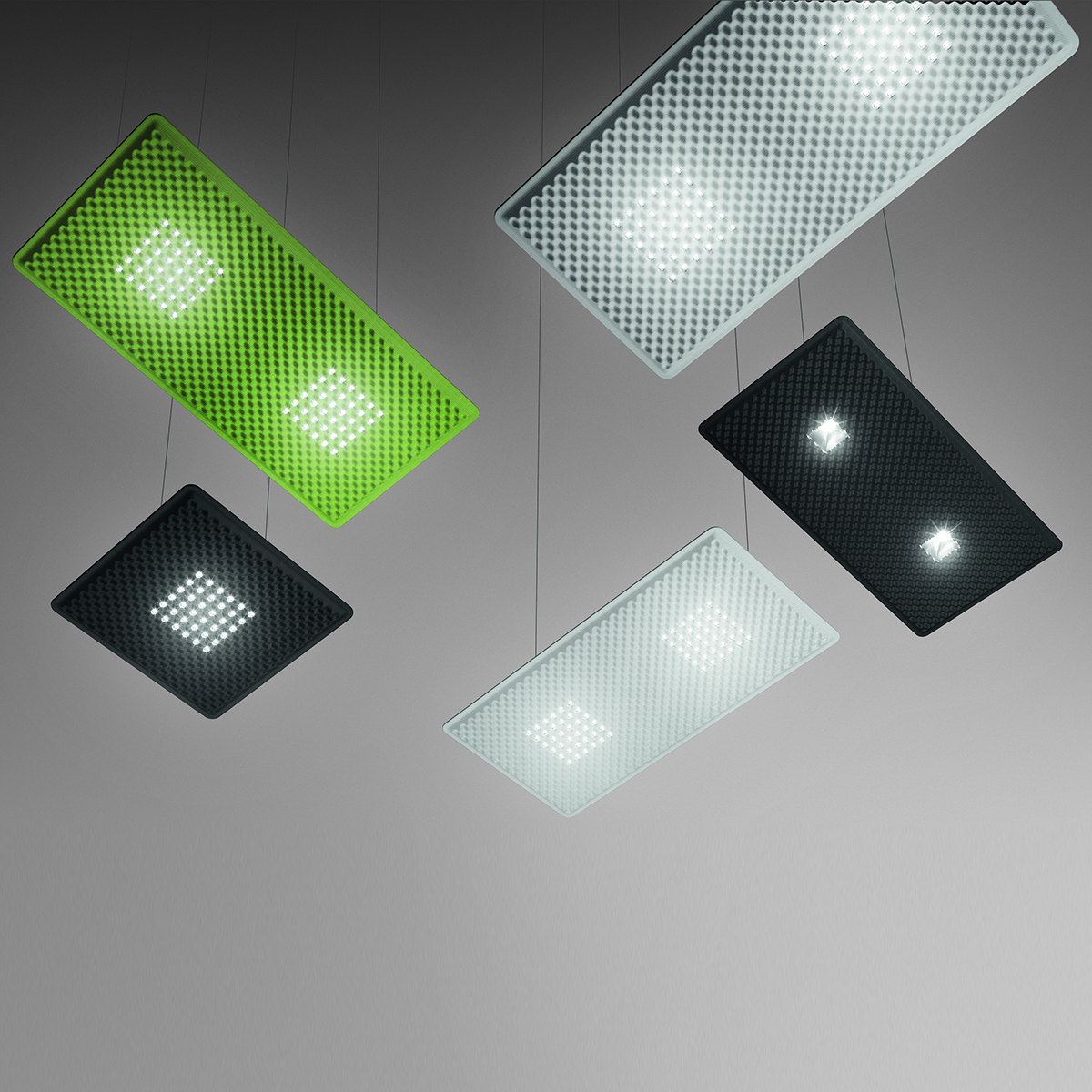 - Quadratische Akustikpendelleuchte in farbenfrohem Design
