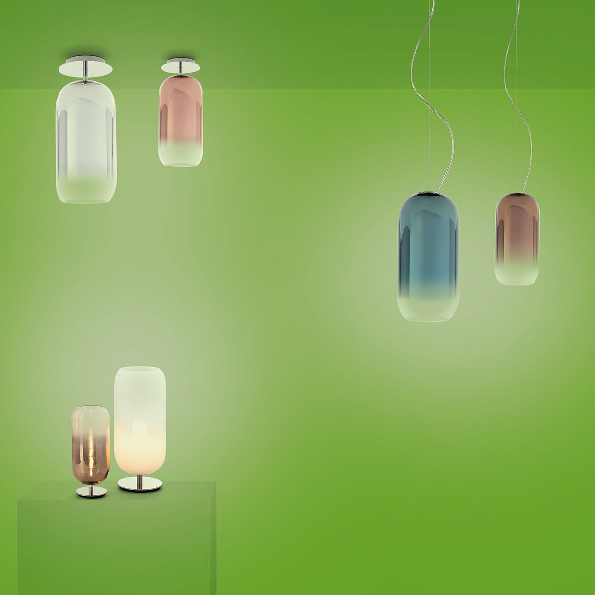 Die Leuchtenschirme der Artemide Gople Mini Deckenleuchte bestehen aus mundgeblasenem Glas, das in einem nachhaltigen Vakuumbedampfverfahren aufwendig metallisiert wird – ohne Emissionen oder überschüssigen Müll zu erzeugen. Jedes Glas ist ein Unikat und kann sich in Form und Beschaffenheit von den anderen Schirmen unterscheiden. Dies ist kein Qualitätsmangel, sondern ein besonderes Zeichen für die künstlerische Arbeit der Glasbläser.