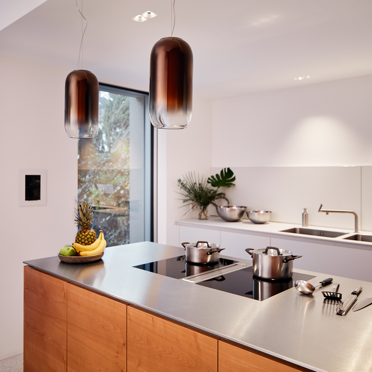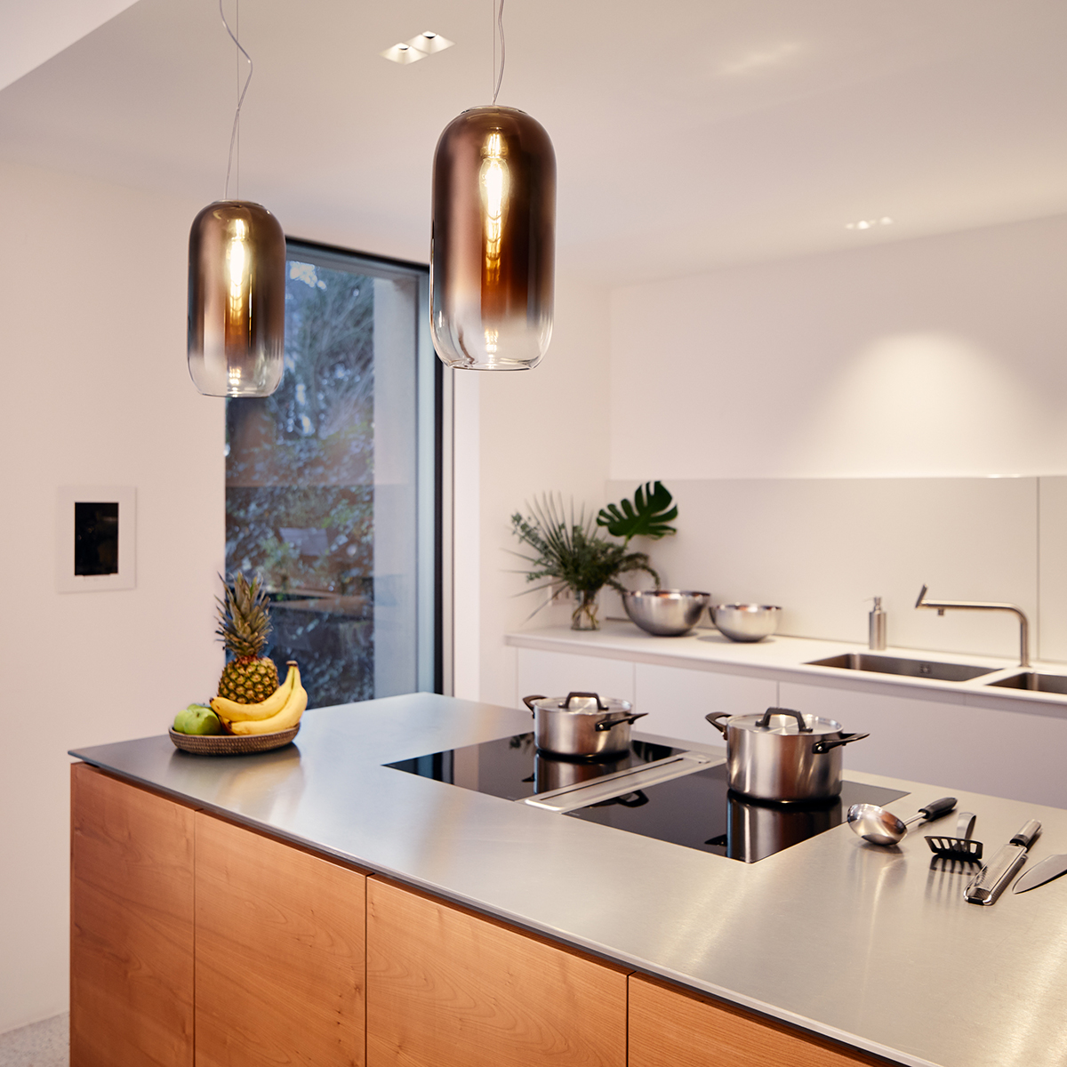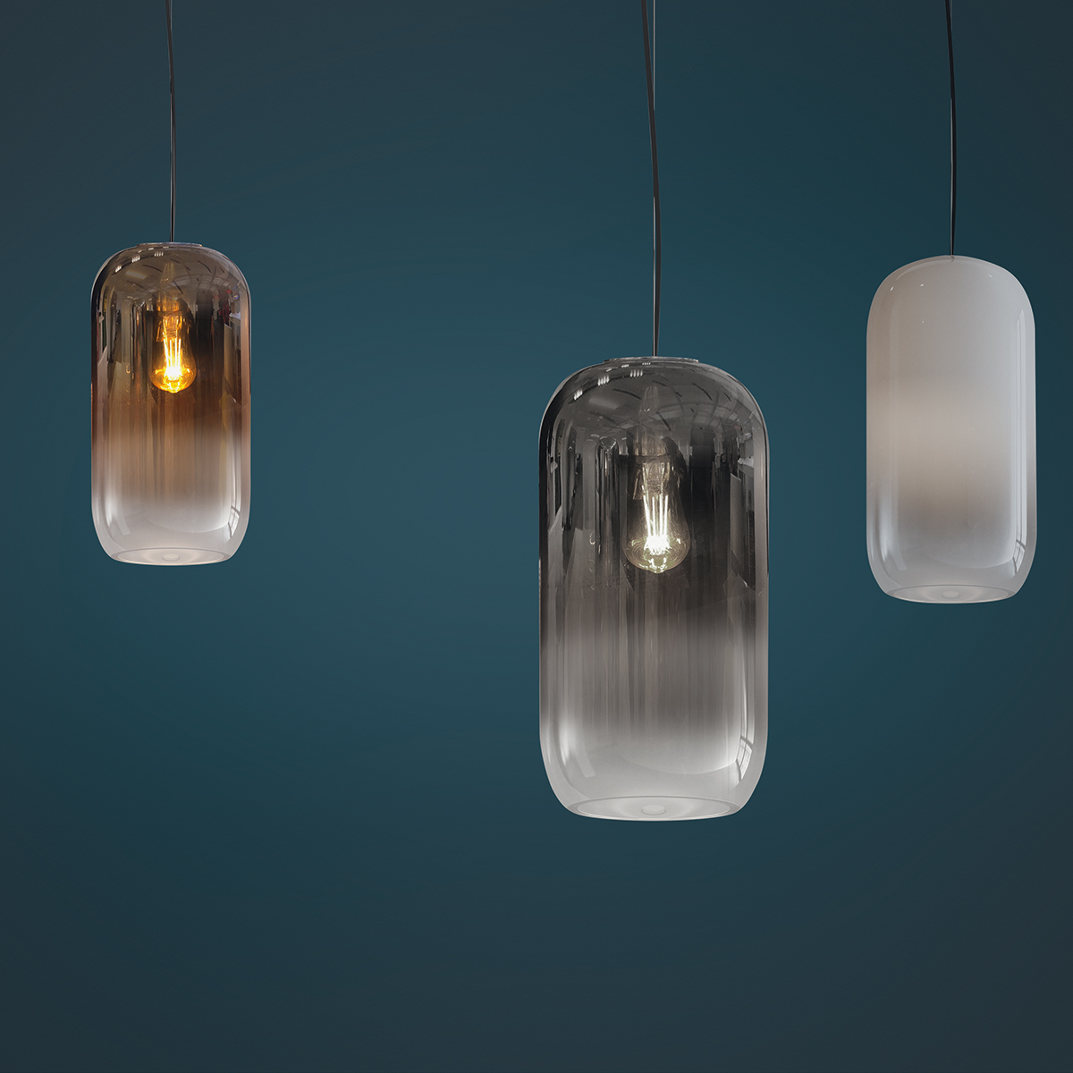 Die Leuchtenschirme der Artemide Gople Mini Sospensione bestehen aus mundgeblasenem Glas, das in einem aufwendigen Vakuumbedampfprozess metallisiert wird – ohne Emissionen oder überschüssigen Müll zu erzeugen. Jedes Glas ist ein Unikat und kann sich in Form und Beschaffenheit von den anderen Glasschirmen unterscheiden. Dies ist kein Qualitätsmangel, sondern ein eindrucksvolles Zeichen für die künstlerische Arbeit der Glasbläser.