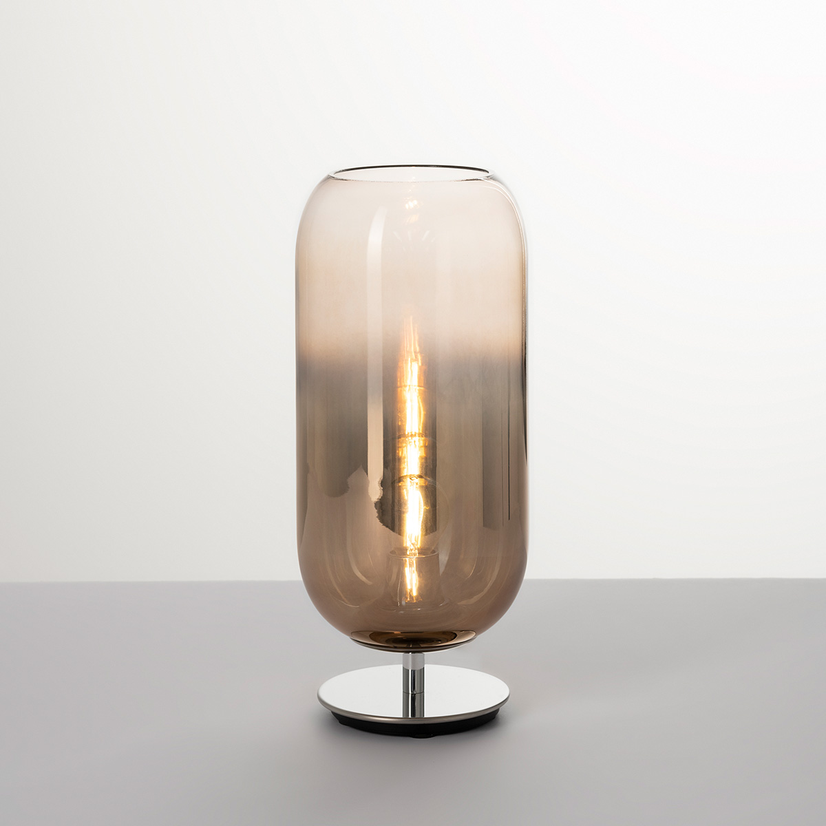 Die Lampenschirme der Artemide Gople Mini Tavolo bestehen aus handverarbeitetem Glas, das in einem aufwendigen Vakuumbedampfprozess metallisiert wird – ohne Emissionen oder überschüssige Abfallstoffe zu erzeugen. Jedes Glas ist ein Unikat und kann sich in Form und Beschaffenheit von den anderen Gläsern unterscheiden. Dies ist kein Qualitätsmangel, sondern ein eindrucksvolles Zeichen für die künstlerische Arbeit der Glasbläser.