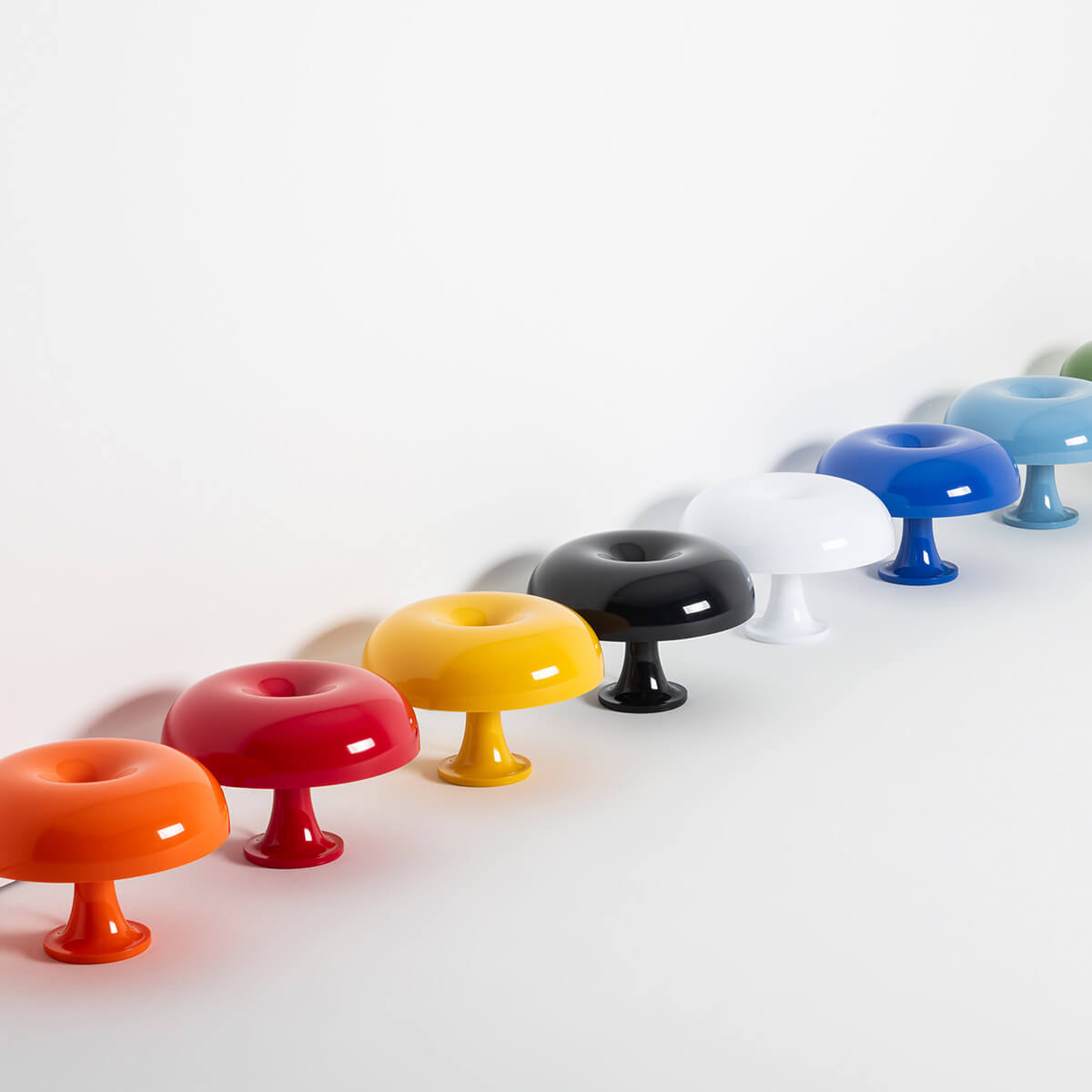 Ihr markanter, pilzförmiger Schirm erinnert an natürliche Formen und verleiht der Leuchte eine organische Ästhetik, die gleichermaßen verspielt und stilvoll wirkt. Das aus Technopolymer gefertigte Gehäuse ist in verschiedenen Farben erhältlich: von zeitlosem Weiß über tiefes Schwarz bis hin zu kräftigem Orange, Rot, Gelb oder Hellblau. So fügt sich die Nessino mühelos in unterschiedliche Einrichtungsstile ein – ob als poppiger Farbakzent im Wohnzimmer, stilvolles Lichtobjekt im Hotel oder stimmungsvolle Nachttischlampe im Schlafzimmer.