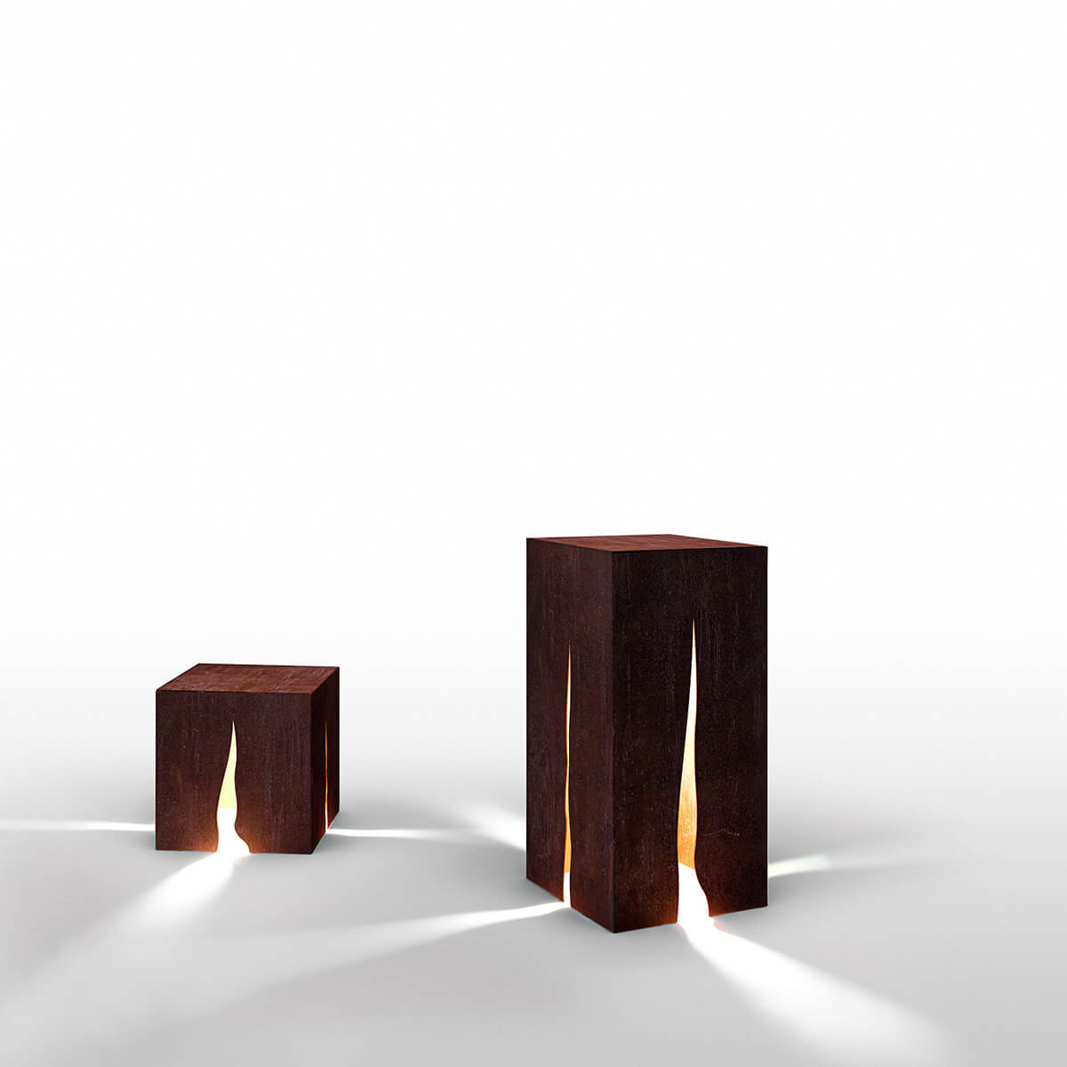 Stabile Außenleuchte aus Cortenstahl mit einer natürlichen Oxidschicht, die zwischen 16 und 24 Monaten Ihre Wirkung zeigt und erst dann richtig stabil wird. Davor kann die Leuchte Rost freisetzen, der Hersteller empfiehlt deshalb, die Granito Leuchten nicht auf hellen Untergründen wie zum Beispiel hellen Steinplatten oder Marmor, zu montieren. Die Oberflächen-Farbe der Leuchten kann sich je nach Witterung im Laufe der Zeit ändern und nimmt einen braunen Farbton an. Gepflegt wird das Produkt mit einem Holzpflege-Bienenwachs und einem weichen Tuch, die Nachbehandlung wird ebenfalls empfohlen, weil die Freisetzung von Rostpulver nach der ersten Behandlung reduziert, aber noch nicht beseitigt wird.