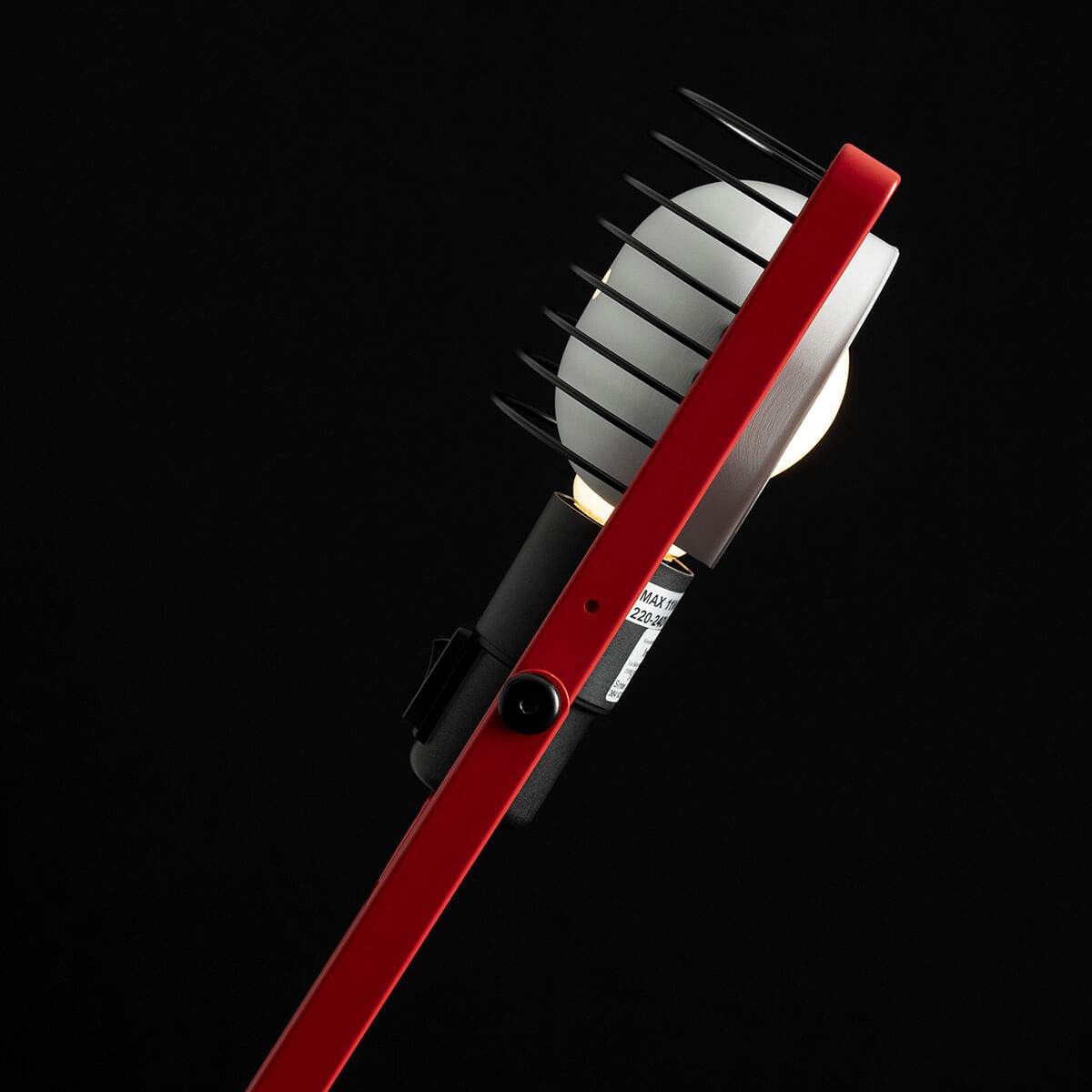 Die neu aufgelegte Tischversion greift die ursprüngliche Formensprache auf und interpretiert sie modern: eine reduzierte, klare Struktur aus gebogenem Metall, die auf das Wesentliche konzentriert ist. Zwei unterschiedlich lange, C-förmige Metallprofile bilden eine Y-förmige Basis, die sich durch einfaches Öffnen und Schließen in Höhe und Neigung verstellen lässt. So lässt sich das Licht präzise ausrichten – für flexibles Arbeiten, Lesen oder Akzentbeleuchtung.