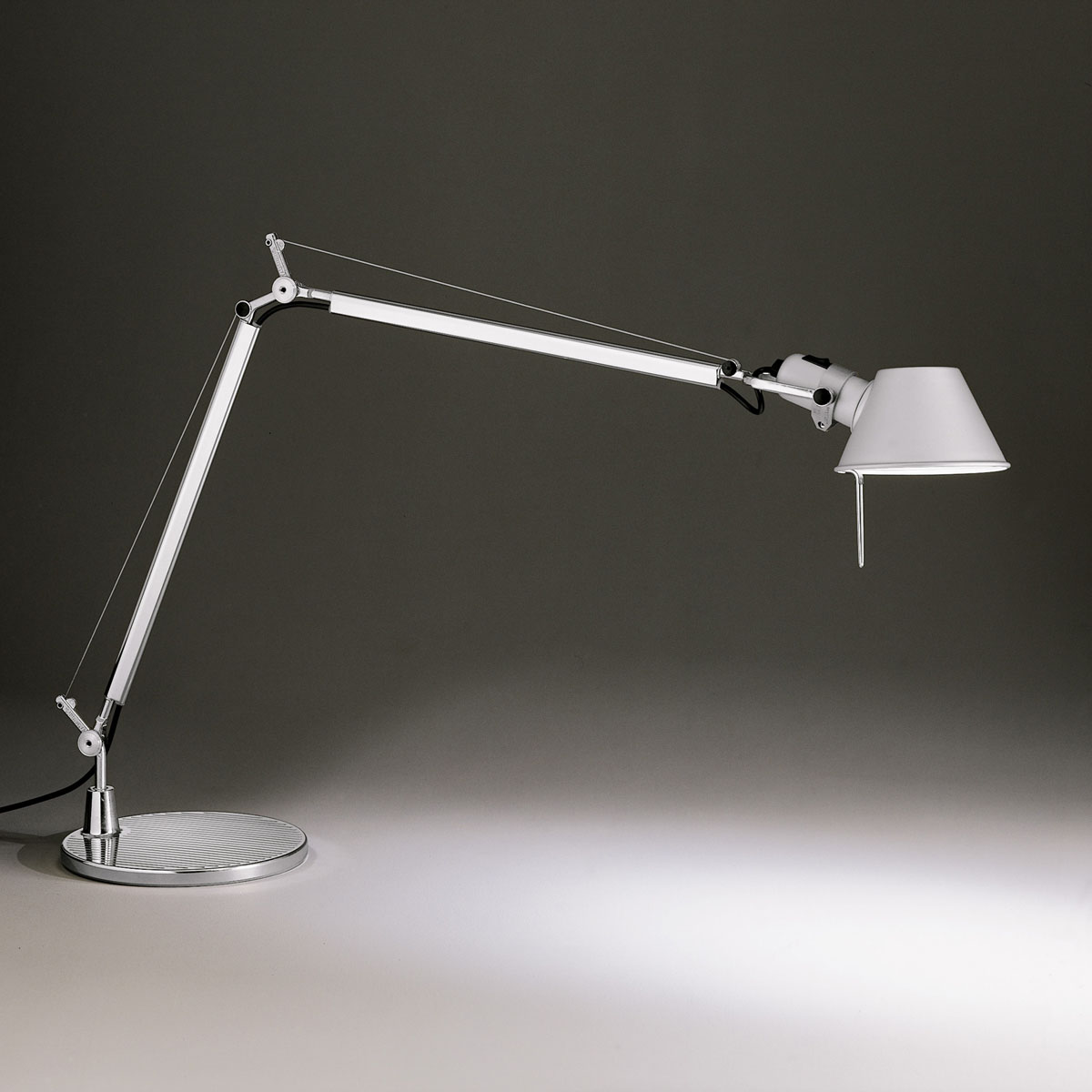 Die Artemide Tolomeo Tavolo setzt sich aus einer kreisrunden Basis und den schlanken, aus Aluminium gefertigen Leuchtenarmen zusammen. Diese lassen sich dank des integrierten Federausgleichsystems – bestehend aus Gelenken aus poliertem Aluminium und über Rollen geführten Drahtseilen – vielfältig ausrichten und den individuellen Bedürfnissen anpassen.