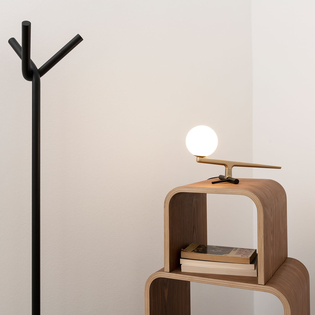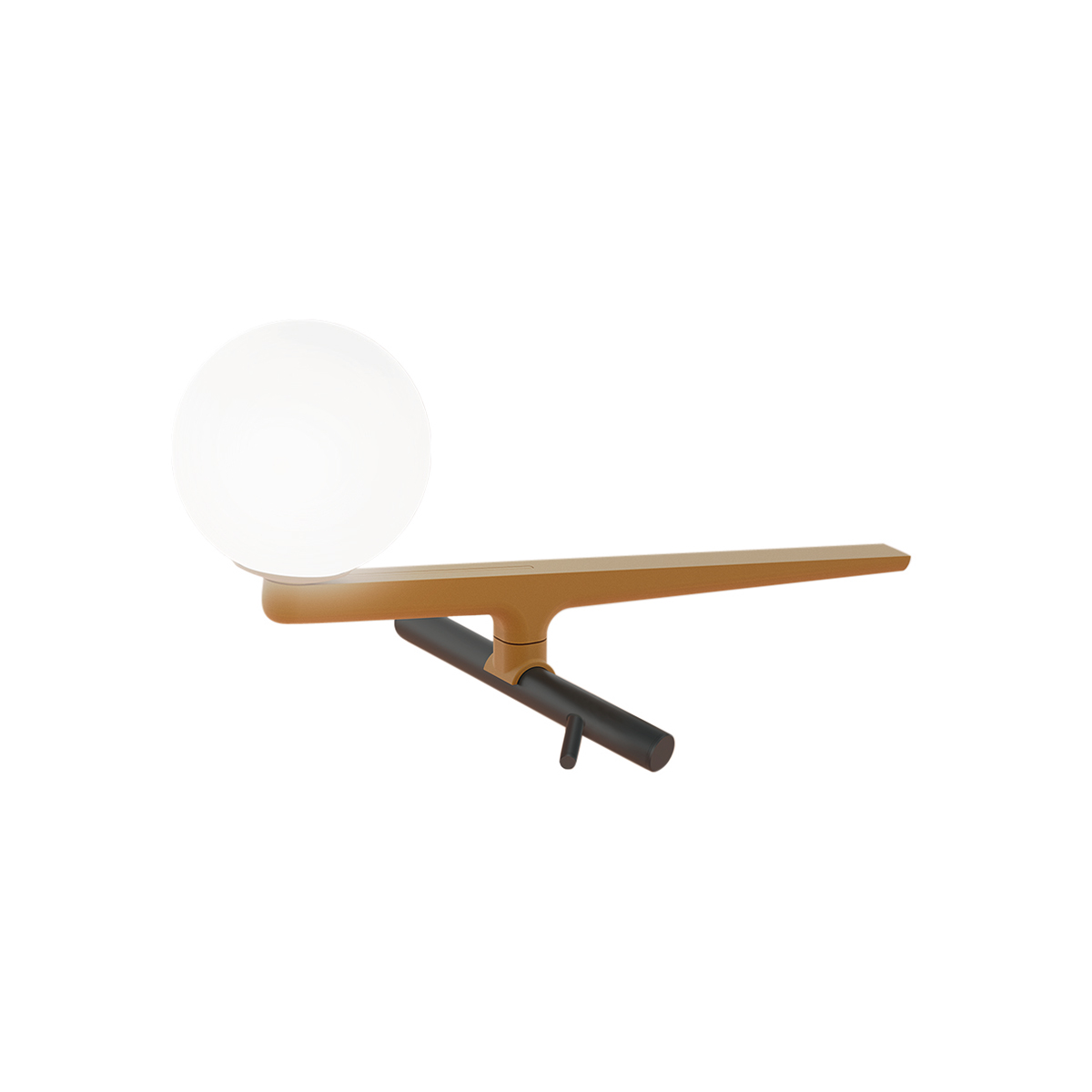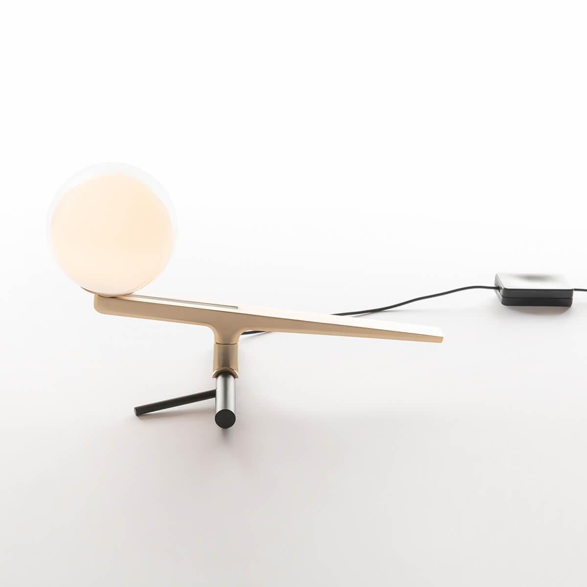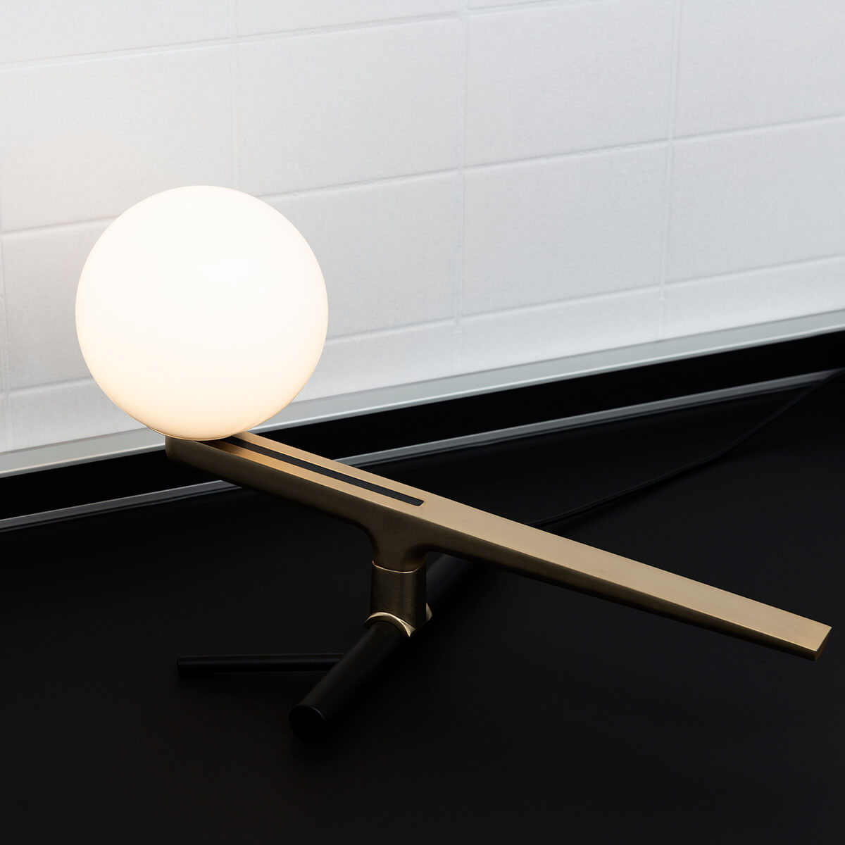 Schwalbenförmige Tischleuchte aus lackiertem Stahl und Messing mit einer weißen Glaskugel, die den Kopf eines Vogel darstellen soll.