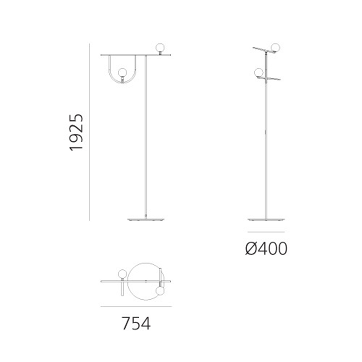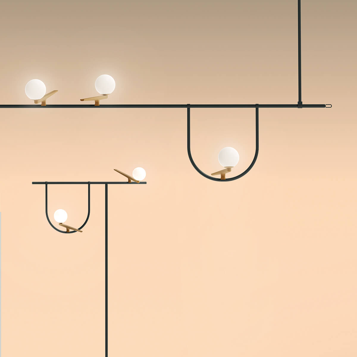 Filigrane Stehleuchte mit zwei schwalbenförmigen Lichtelementen in Messing mit je einer weißen Glaskugel, die für eine ringsum diffuse Lichtausstrahlung sorgt.