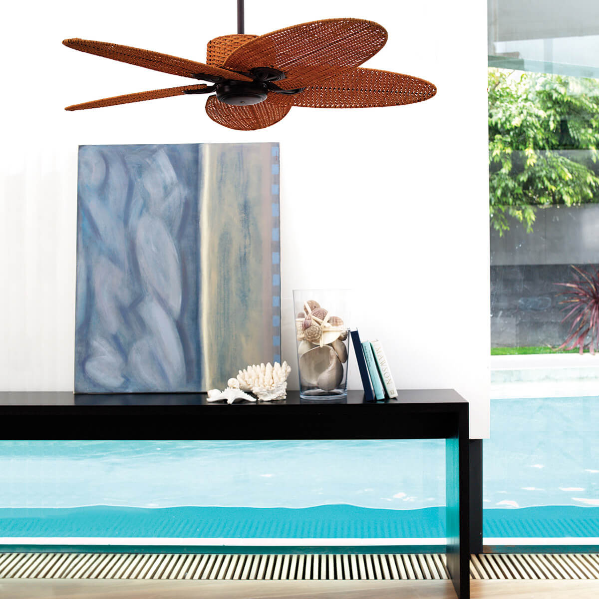 Blickpunkt des Designs sind die fünf großen Ventilatorflügel aus leichtem ABS-Kunststoff, die in Form von Palmenblättern gehalten und in einer ansprechenden Rattan-Optik gestaltet sind. Sie machen den Deckenventilator Fijian II zu einem echten Design-Highlight und schaffen in jedem Raum ein südseetypisches Ambiente.