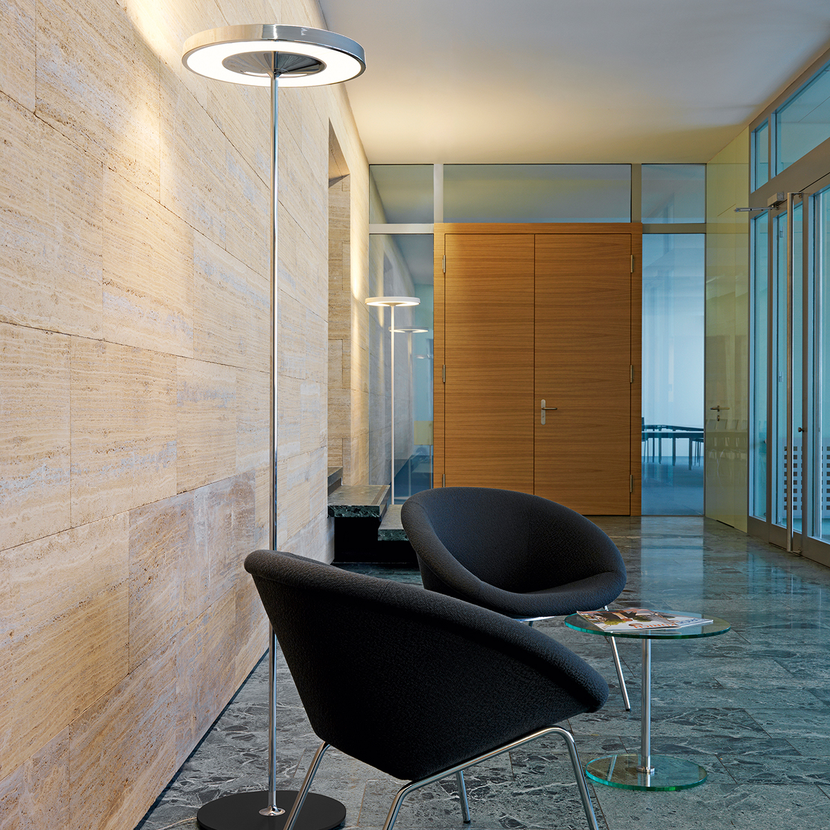Die moderne Disk-10 LED Stehleuchte ist mit ihrem doppelten Lichtaustritt hervorragend zur energieeffizienten Ausleuchtung von Arbeitsplätzen geeignet. Die universell einsetzbare Leuchte besticht durch die gelungene Kombination aus geometrischer Klarheit und dynamischer Linienführung.