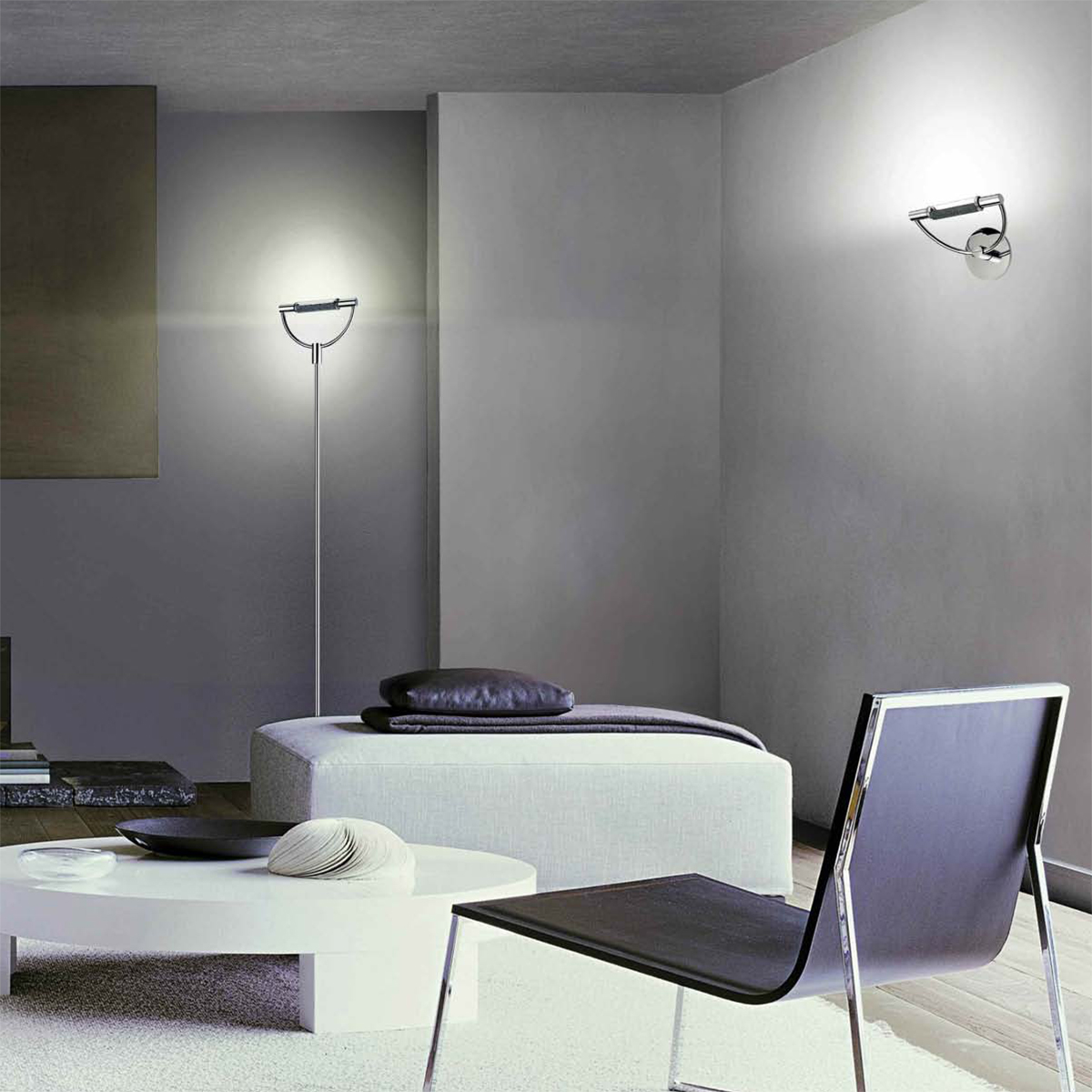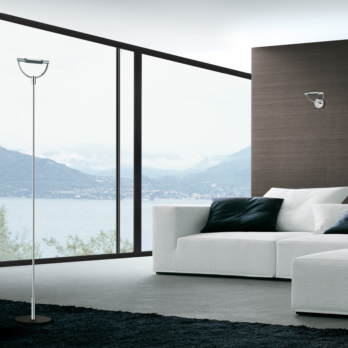 Die Cini & Nils Graditerra retinato Stehleuchte ist in glanzverchromter oder satiniert-vernickelter Ausführung zu erwerben. Basen in unterschiedlicher Tönung erweitern die Produktpalette und bieten eine individuelle Art der Gestaltung.