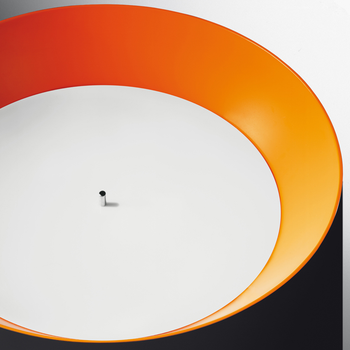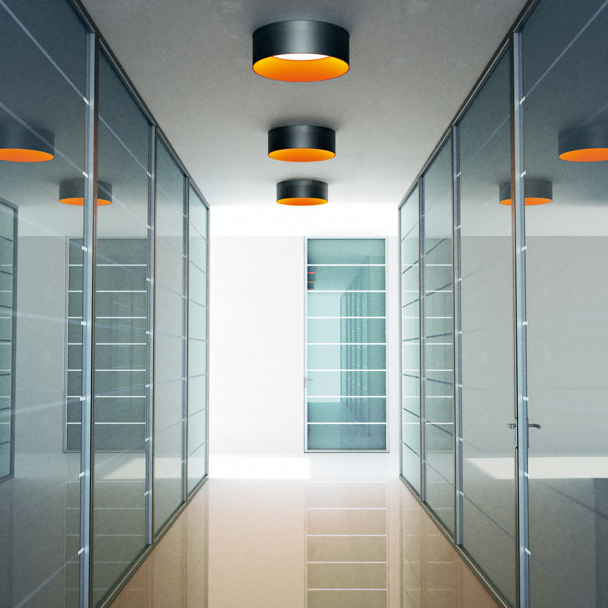Kreisrund geformte Deckenanbauleuchte in schwarz-orangefarbener Ausführung. Elektronisches Vorschaltgerät inbegriffen!
