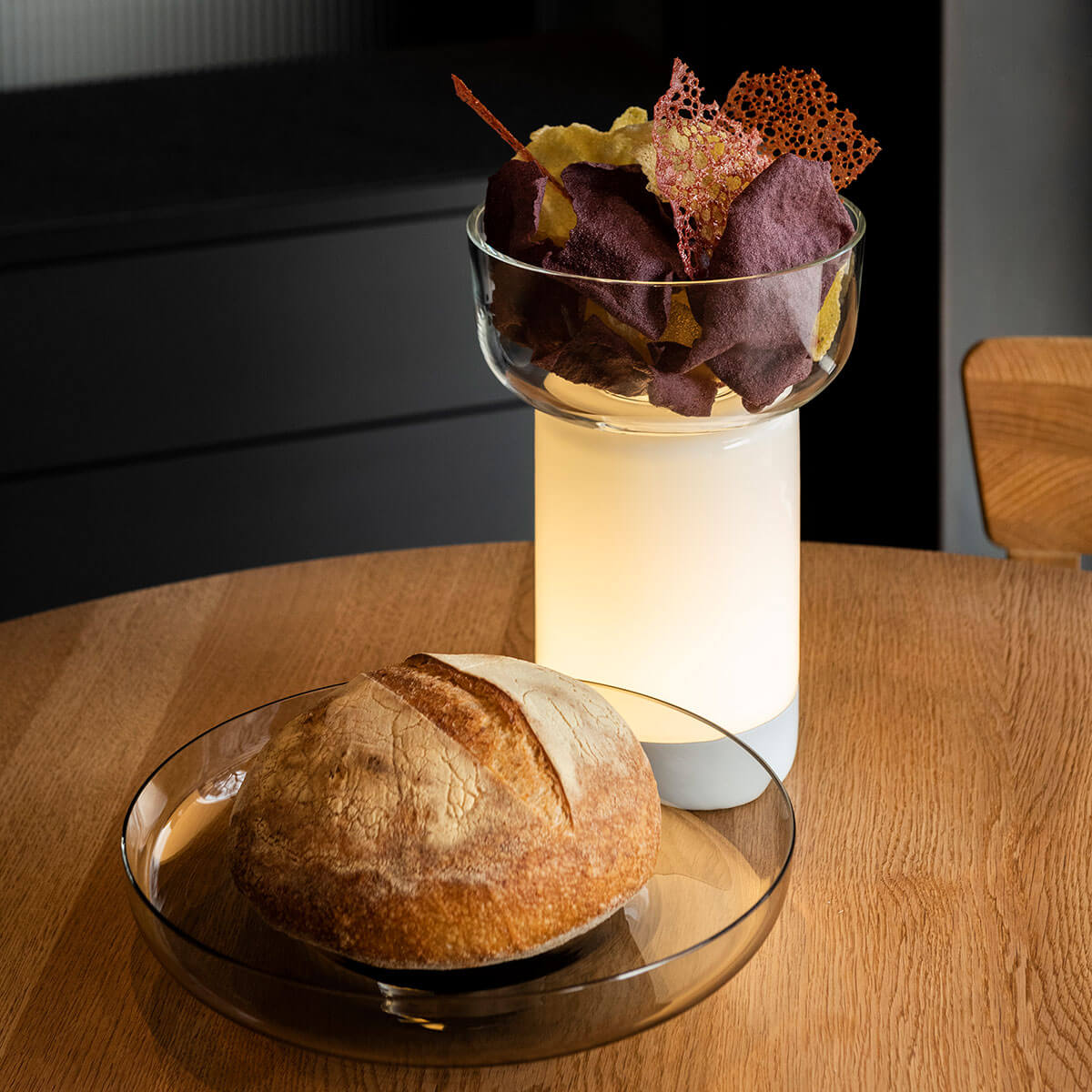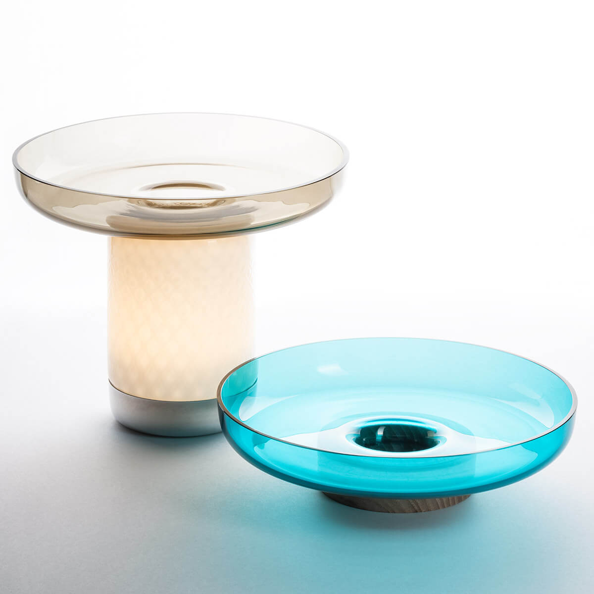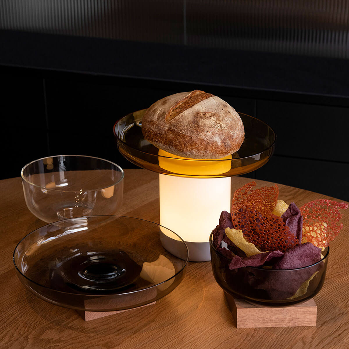 Der Bontà Glasteller ergänzt die dekorative Artemide Bontà Leuchtenkollektion. Er kann allein oder zusammen mit der mitgelieferten Basis aus Holz verwendet werden. Der Holzsockel sorgt für Stabilität, sodass der Teller auch auf kleineren Tischen eine schöne Dekomöglichkeit bietet. Zudem kann das Glas auf die Bontà Portable LED Akkuleuchten aufgesetzt werden. So entsteht eine originelle Kombination aus kabellosem Lichtobjekt und Ablagemöglichkeit für Obst, Süßigkeiten und kleinere Dekorationsgegenstände. Der von Hand in Italien gefertigte Glasteller ist in vier wunderschönen Farben erhältlich.