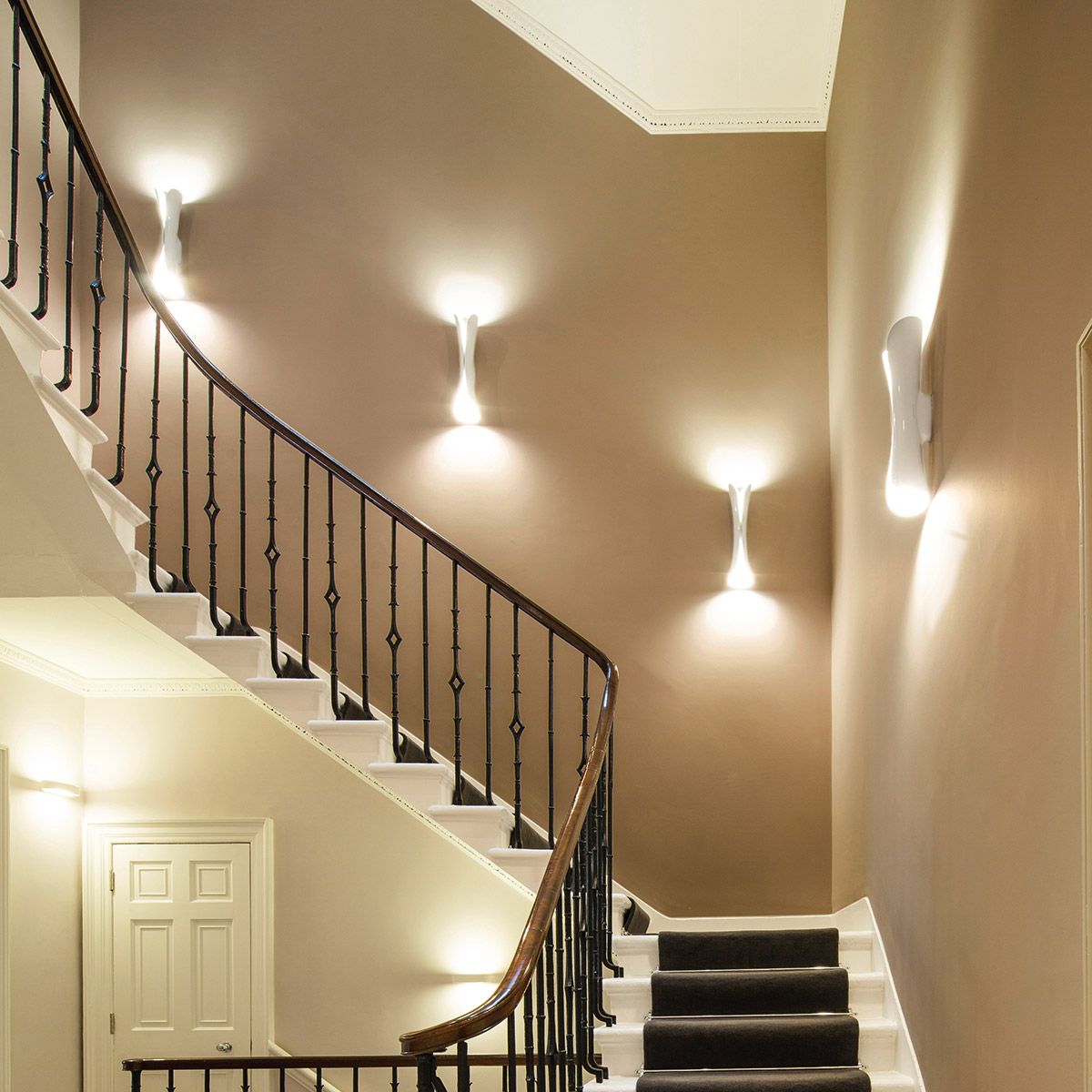 An ihrem oberen und unteren Ende ist die Leuchte offen belassen und ermöglicht so einen indirekten, aufwärts gerichteten sowie direkten, nach unten weisenden Lichtaustritt. Dies macht die Artemide Cadmo Wandleuchte zu einem stylishen Einrichtungsobjekt, um Wandflächen mittels Licht zu strukturieren.