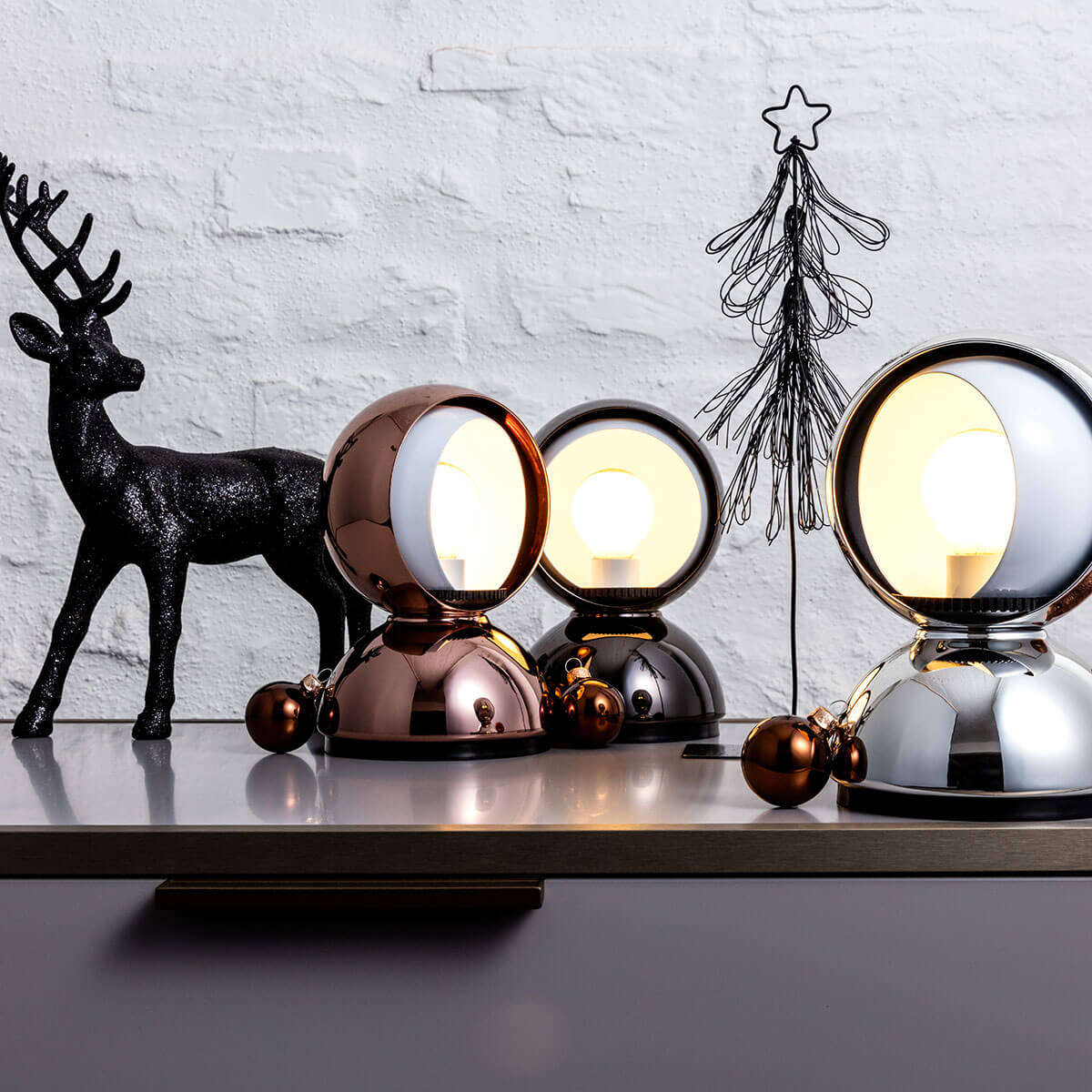 Besonders exklusiv wirken die Tischlampen in metallisch anmutendem Kupfer, Chrom, Gold und Schwarz-Glanz. Diese Farbvarianten wurden anlässlich des 100. Geburtstages von Vico Magistretti auf den Markt gebracht und zeichnen sich durch eine besonders nachhaltige PVD-Beschichtung aus: Bei der Herstellung dieser kristallklaren Decklackierung werden keine Emissionen produziert und nur 5 % Lösungsmittel verwendet (gegenüber 75 % bei gewöhnlichen Prozessen).