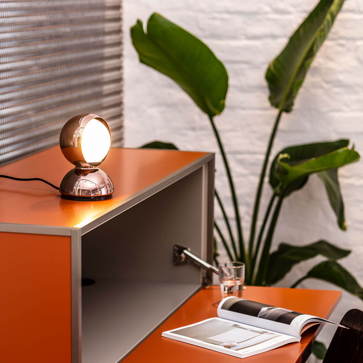 Klein, aber oho! Die Artemide Eclisse Tavolo, ein Designentwurf von Vico Magistretti aus dem Jahr 1965, ist exemplarisch für das italienische Design der 1960er-Jahre und zugleich von origineller Handhabung. Die farbenfrohe Tischleuchte ist kurvenreich inszeniert und damit besonders verspielt in der Anmutung.