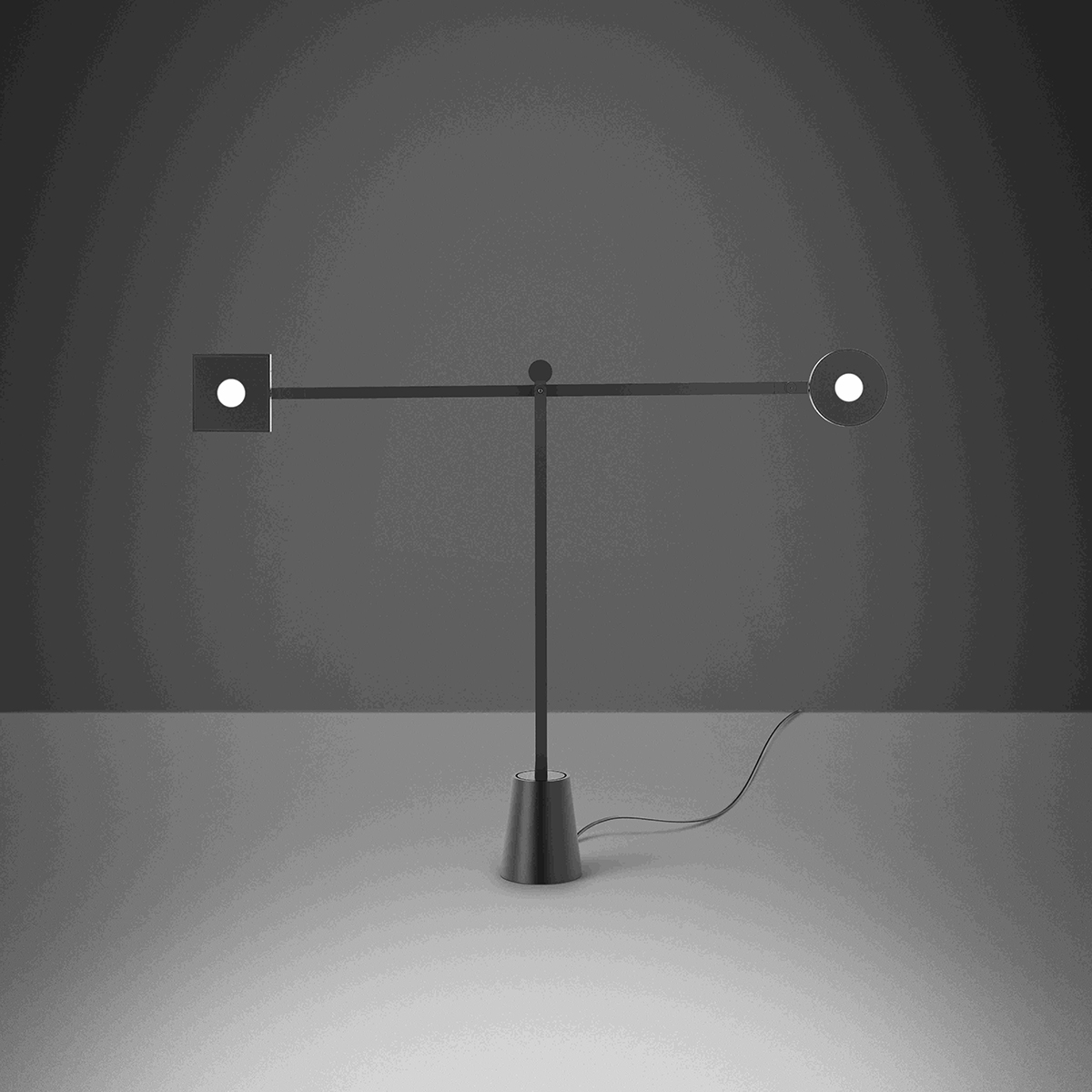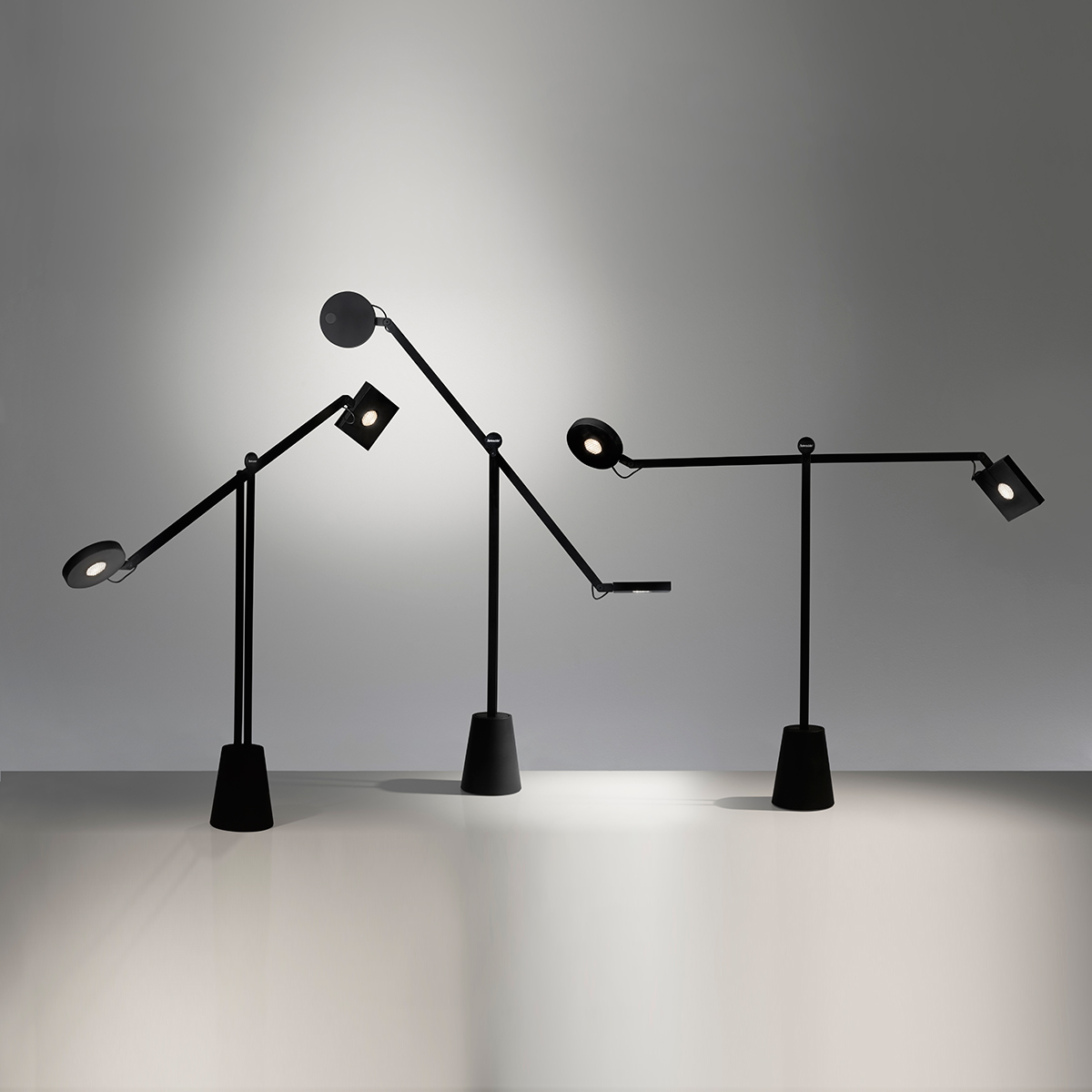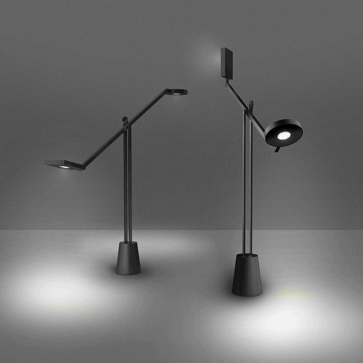 - Originelle Tischleuchte mit beweglichem Schwingarm und allseits verstellbaren Leuchtenköpfen (einmal rund, einmal quadratisch in der Ausformung)