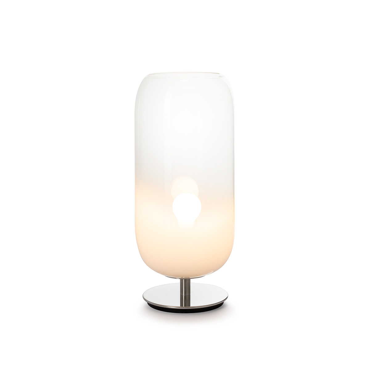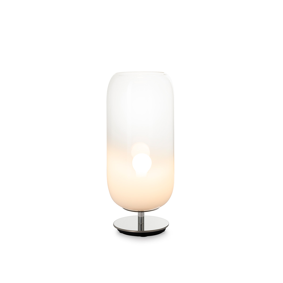 Die Lampenschirme der Artemide Gople Mini Tavolo bestehen aus handverarbeitetem Glas, das in einem aufwendigen Vakuumbedampfprozess metallisiert wird – ohne Emissionen oder überschüssige Abfallstoffe zu erzeugen. Jedes Glas ist ein Unikat und kann sich in Form und Beschaffenheit von den anderen Gläsern unterscheiden. Dies ist kein Qualitätsmangel, sondern ein eindrucksvolles Zeichen für die künstlerische Arbeit der Glasbläser.