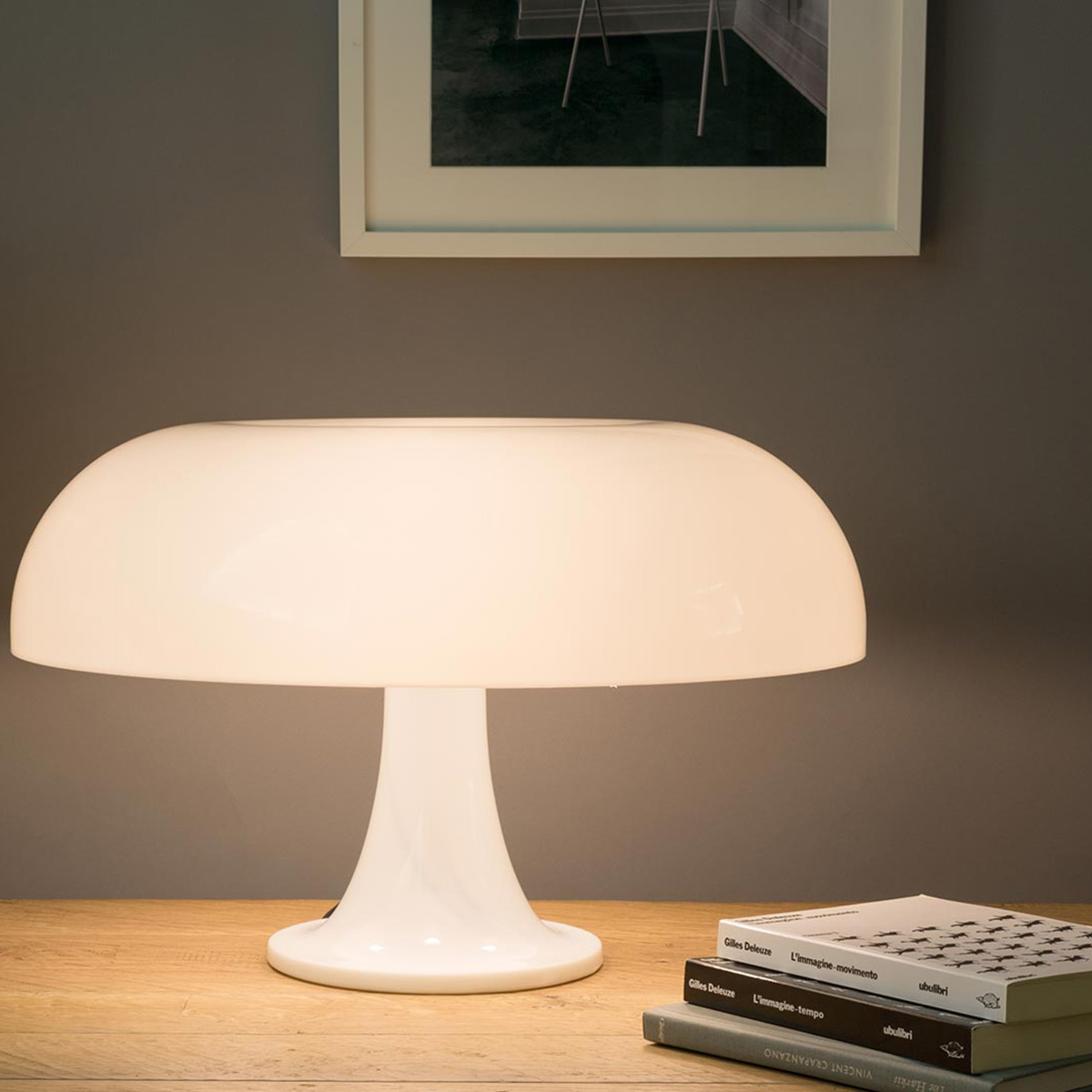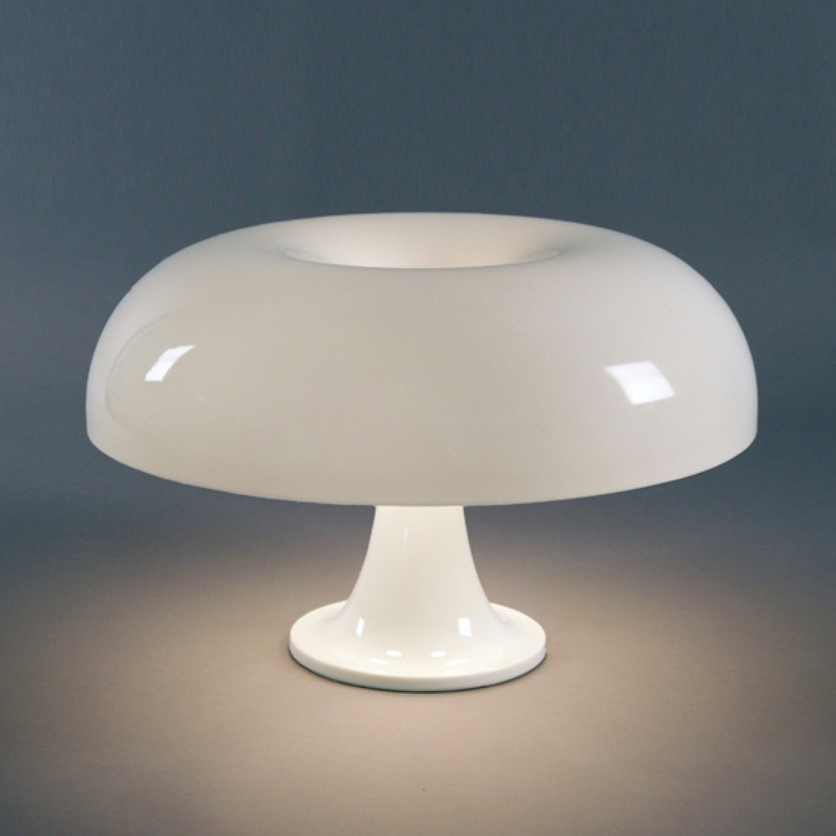 Der sanft geschwungene Standfuß besteht ebenso wie der ausladende Leuchtenschirm der Artemide Nesso aus ABS-Kunstharz, das im Spritzgussverfahren hergestellt wird. Vier Leuchtmittel im Innern des gewölbten Schirms gewährleisten eine diffus gestreute, nach unten gerichtete Lichtausstrahlung.