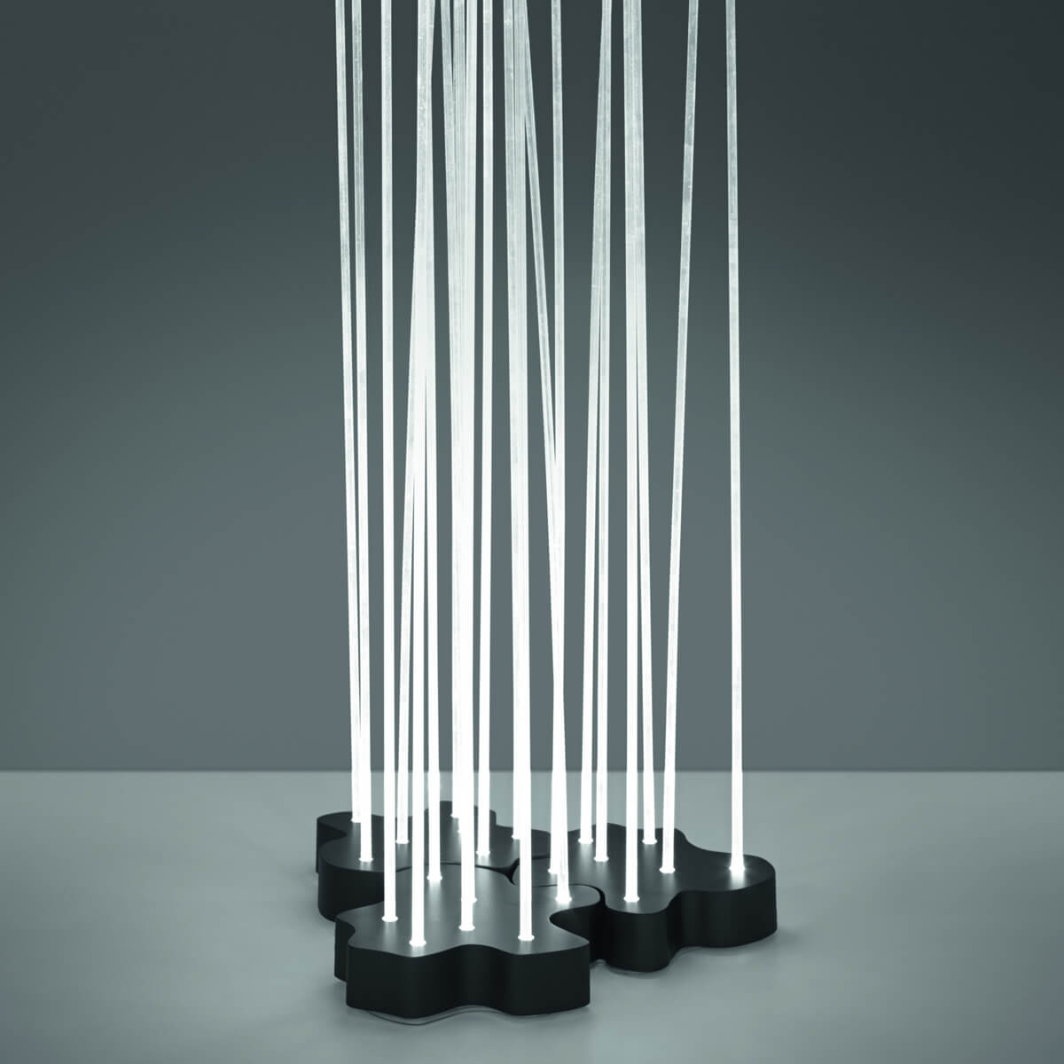Statt sanft im Wind wiegender Stiele sind es aus transparentem Kunststoff gefertigte Stäbe, die über Edelstahlbuchsen am anthrazitgrau lackierten Sockel befestigt sind. Als schimmernde Halme sorgen sie für einen diffus gestreuten Lichtaustritt, zugleich wird ein Teil des Lichts um den Sockel herum auf den Boden gestreut. Der Sockel der Artemide Reeds Outdoor LED Bodenleuchte hat die Form eines sanft geschwungenen Mosaiks, um mehrere Bodenleuchten zu einer attraktiven Komposition aneinanderzufügen.