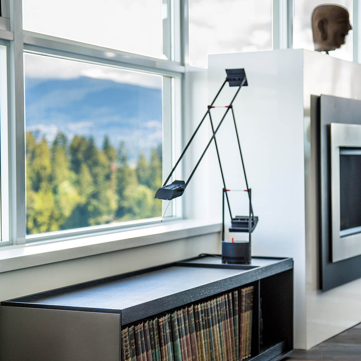 Gefertigt ist der Korpus der Artemide Tizio LED Tavolo aus lackiertem Aluminium und Polycarbonat. Kennzeichnende Elemente des Designs sind die doppelläufigen, mit Gegengewichten versehenen Leuchtenarme, die sich bis zu einer maximalen Ausladung von 108 cm schwenken lassen. Zusätzliche Flexibilität bietet der verstellbare Kopf, der für eine konzentrierte und helle Beleuchtung sorgt, während die restliche Umgebung in einem unauffälligen Halbdunkel verbleibt.