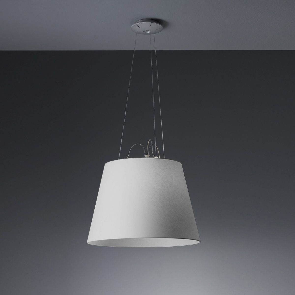 Schlicht, einfach und doch bezaubernd schön – die Tolomeo Mega Sospensione ergänzt die von Michele De Lucchi und Giancarlo Fassina kreierte Leuchtenserie Artemide Tolomeo und besticht durch ihre filigrane Struktur und das zurückhaltende Design. Der ausladende Leuchtenschirm ist aus mit Kunststoff stabilisiertem Pergamentpapier, Seidensatin oder schwarzem Stoff gefertigt und gewährleistet eine direkte und diffus gestreute Lichtausstrahlung. Die zarten Seilzüge der Artemide Tolomeo Mega Sospensione, welche den Diffusor mit der abgerundeten Deckenrosette verbinden, dienen nicht nur der Aufhängung, sondern fungieren zugleich als Netzkabel zur Stromversorgung.