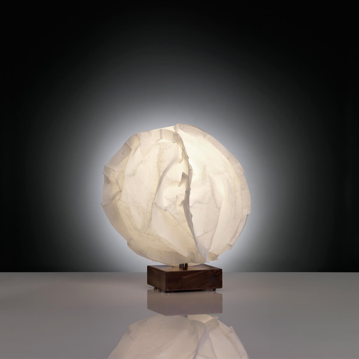 Kernpunkt des Designs bildet der voluminöse Leuchtenschirm, der aus leicht faserigem Polyestervlies gefertigt ist. Dieses erinnert in Gestalt und Haptik an Papier, ist dank mehrfacher Veredelung jedoch deutlich reißfester, alterungsbeständig und leicht zu reinigen. Kunststoffclips und ein transparenter Ring aus Polycarbonat halten den Schirm in Form, der mit seinen Falten und Ausbuchtungen an einen weichen Schneeball oder eine luftige Schönwetterwolke erinnert.