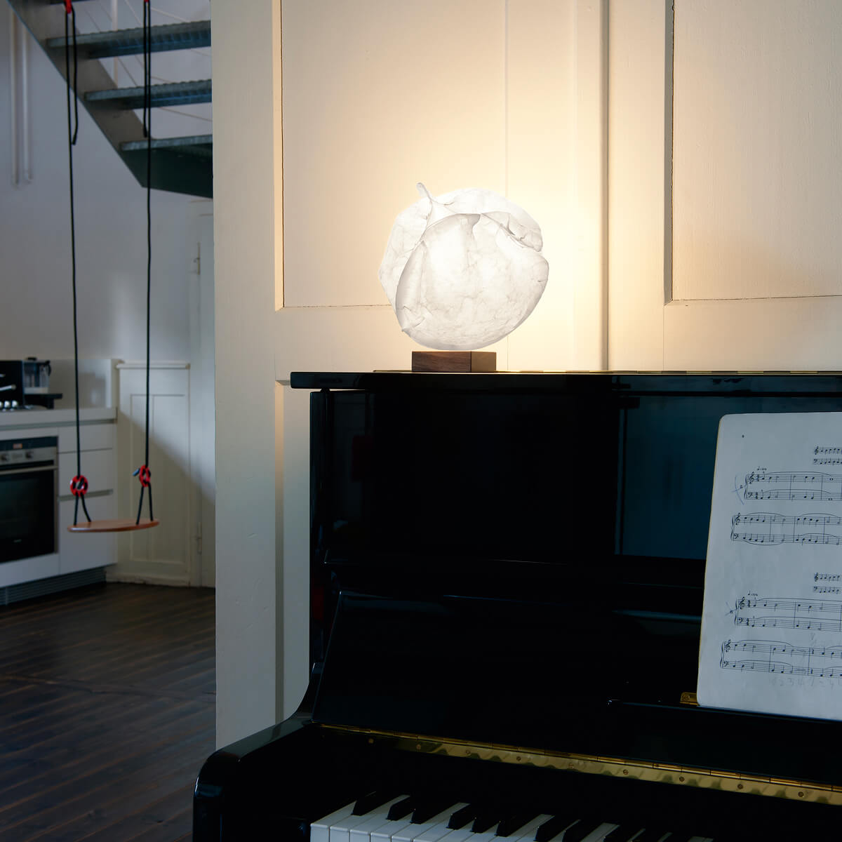 Bestückt wird die Tischlampe mit austauschbaren G9-Lampen; ein passendes LED-Leuchtmittel ist im Lieferumfang inbegriffen. Eingeschaltet erzeugt die Leuchte ein rundum gestreutes, behagliches Stimmungslicht. Eine edle und zugleich warme Note erhält sie durch ihren Fuß aus hochwertigem Nussbaumholz, das Standrohr besteht aus verchromtem Stahl. Über einen Schnurschalter wird die Babycloud-45 bedient.