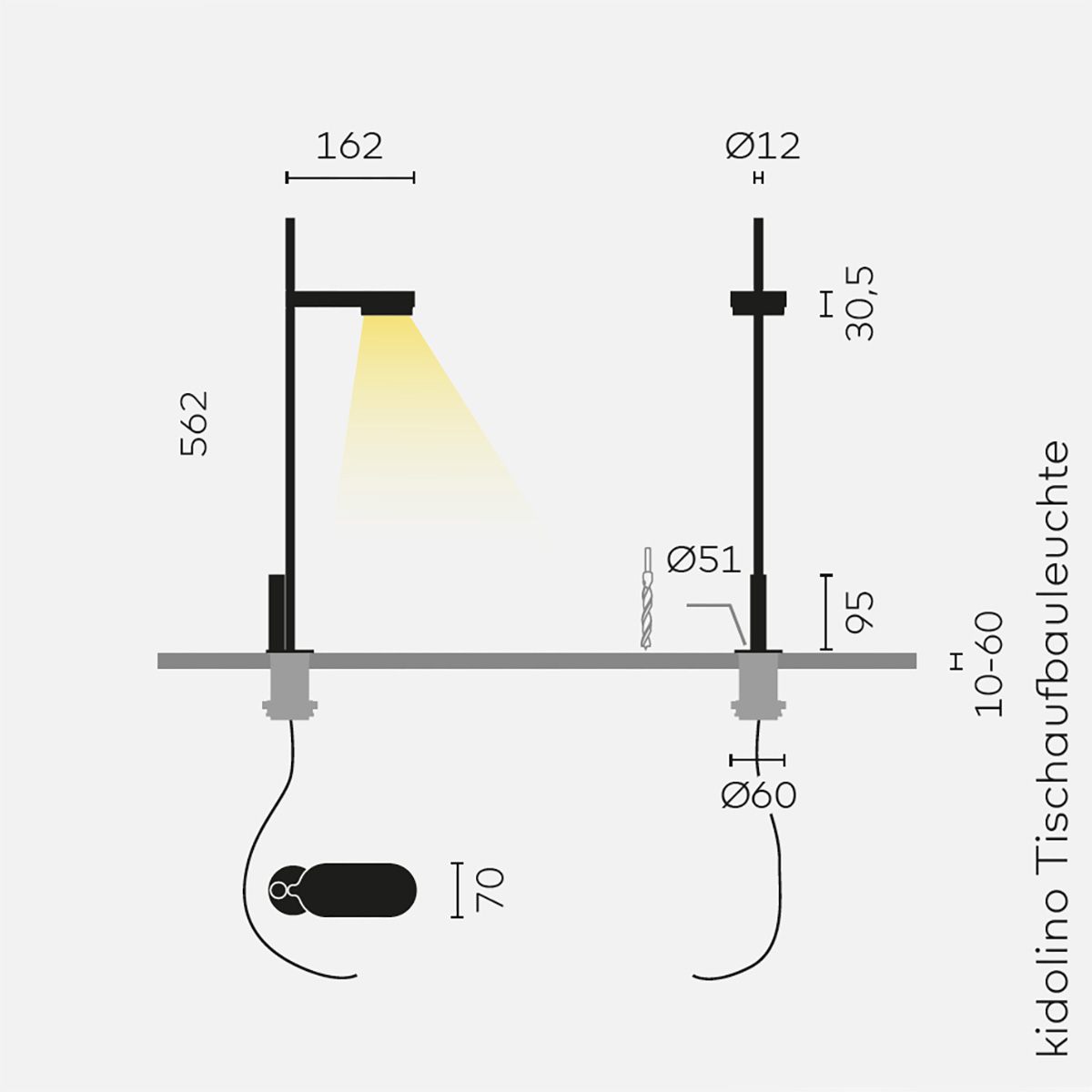 Die Tischeinbau-Version wird mit einem Gewindeadapter (Ø 5,1 cm) verschraubt und eignet sich für Tischstärken von 10 bis 60 mm. Der Kabelauslass unterhalb der Tischplatte sorgt für ein aufgeräumtes Erscheinungsbild. Trotz fixer Montage lässt sich der Leuchtenarm am Sockel um 100° drehen, um das Licht präzise auf den gewünschten Arbeitsbereich auszurichten – ideal für dynamische Arbeitsumgebungen mit wechselnden Aufgabenstellungen.