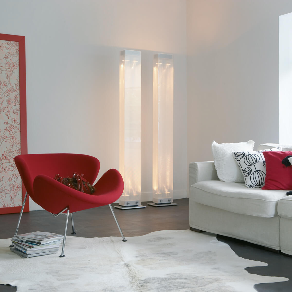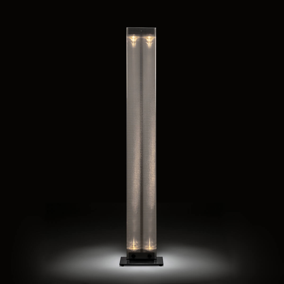 Erhältlich ist der Deckenfluter in zwei edlen Ausführungen: Die Variante mit gebürstetem Edelstahlsockel und transparentem Diffusor unterstreicht die zeitlose Modernität des Designs und fügt sich harmonisch in verschiedenste Einrichtungsstile ein. Die schwarze Version setzt stilvolle Akzente: Mit ihrem tiefschwarzen Sockel und der speziell eingefärbten Säule entsteht ein extravagantes Ambiente mit einer einzigartigen Lichtwirkung.