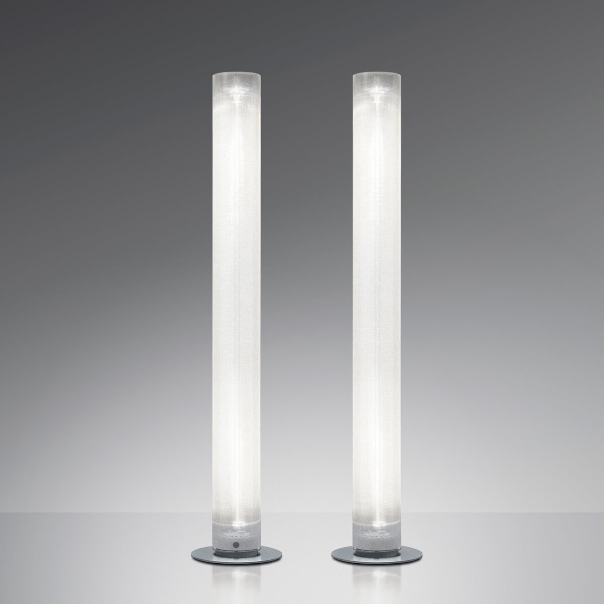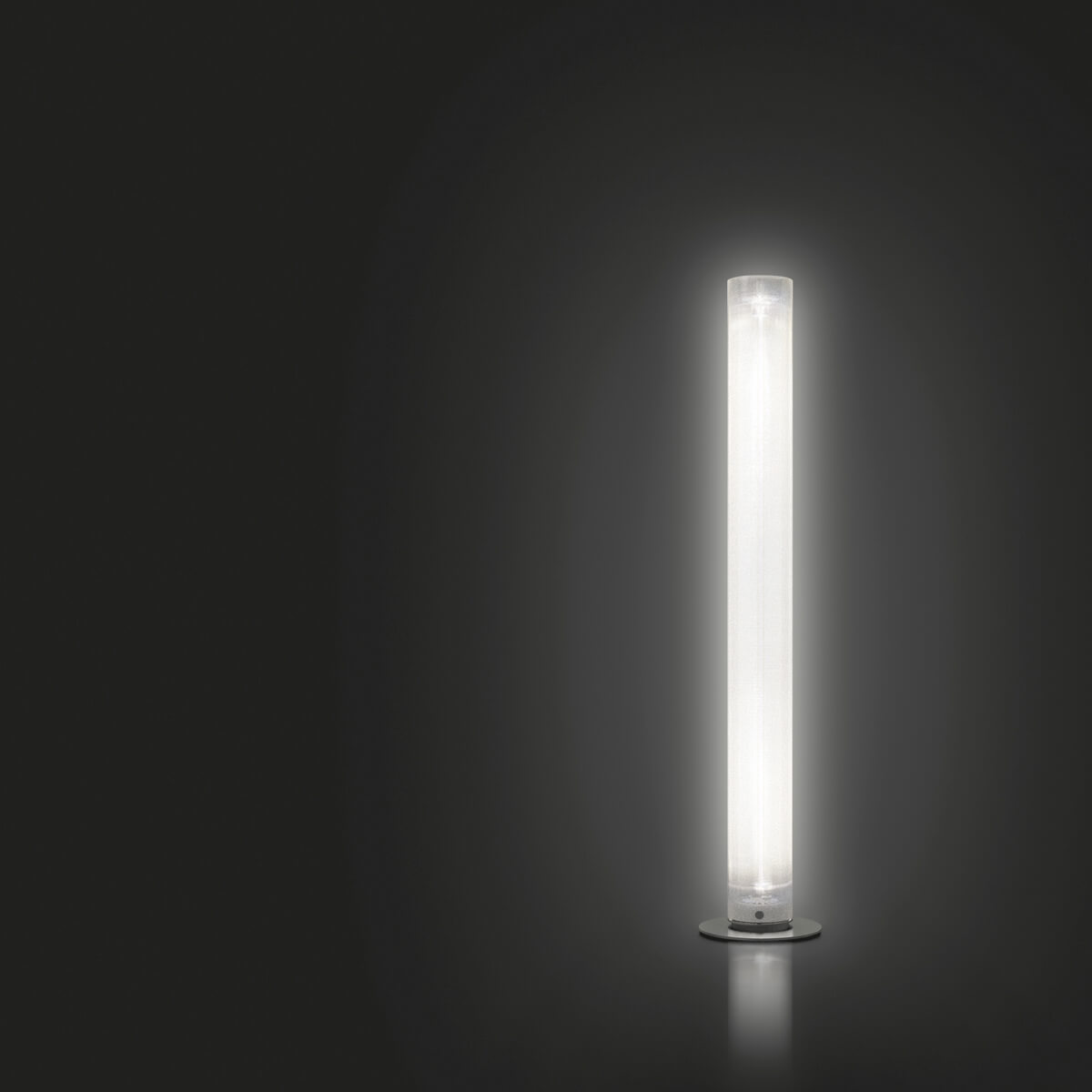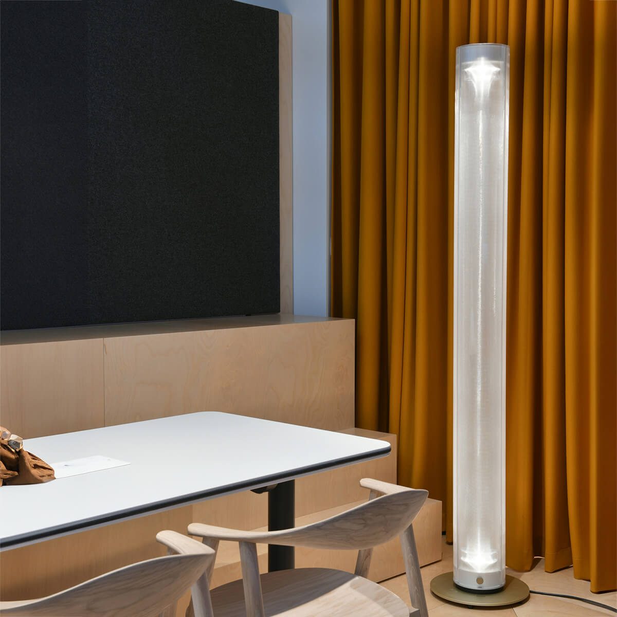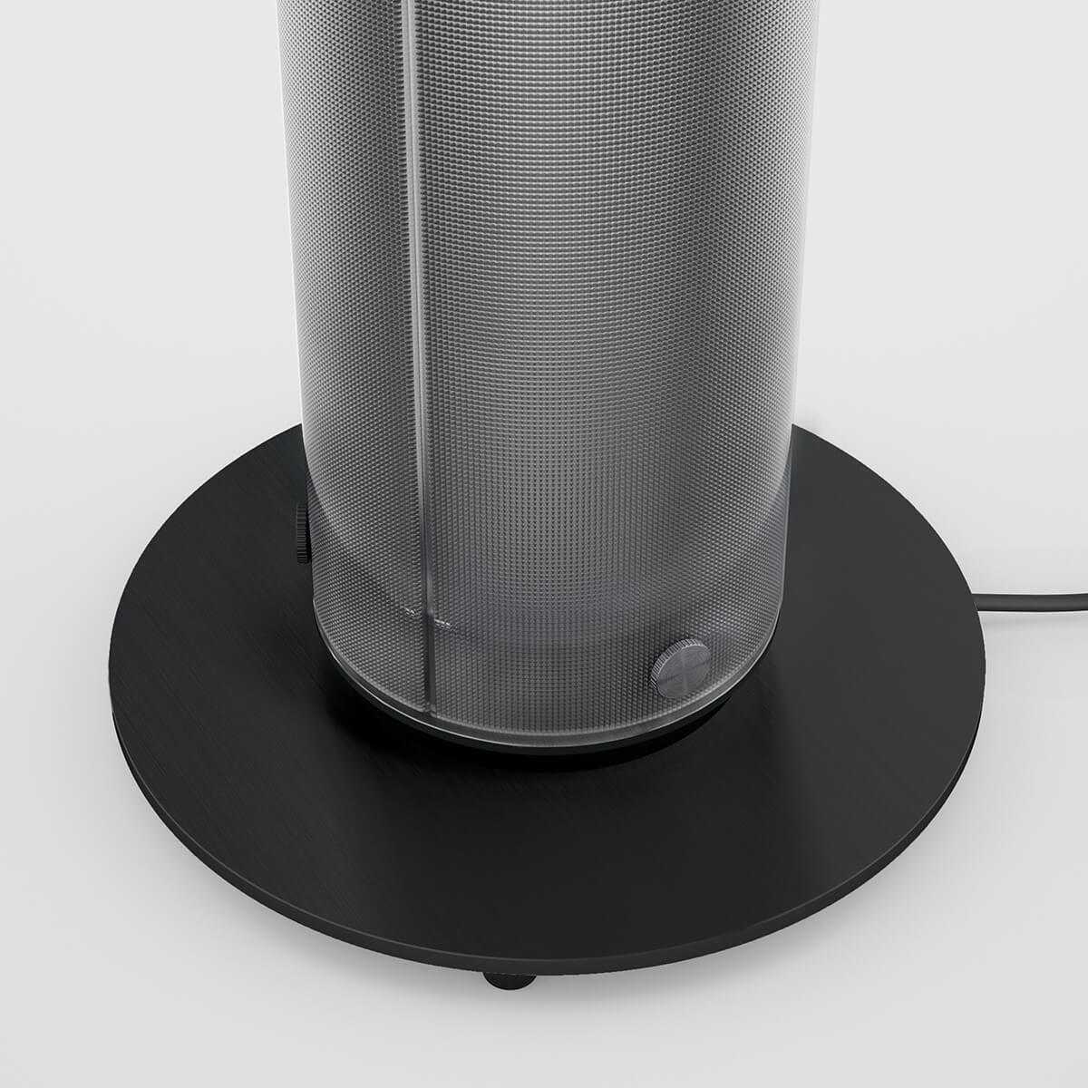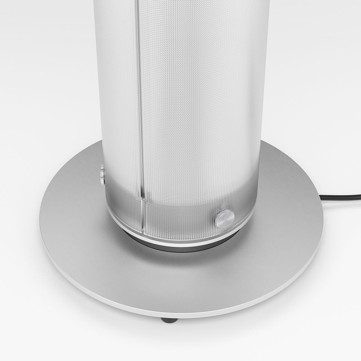 Die Stehlampe beeindruckt nicht nur durch ihr innovatives Lichtkonzept, sondern auch durch ihre erstklassige Materialqualität. Der Sockel ist in Aluminium oder eloxiertem Dark Bronze erhältlich; für ein besonders ausdrucksstarkes Design sorgt die schwarze Variante mit ihrem lackierten Sockel und dem schwarz eingefärbten Schirm. Die gebogene Prismenstruktur des Acrylglasdiffusors erzeugt ein faszinierendes Lichtspiel, das sich mit jeder Perspektive verändert.