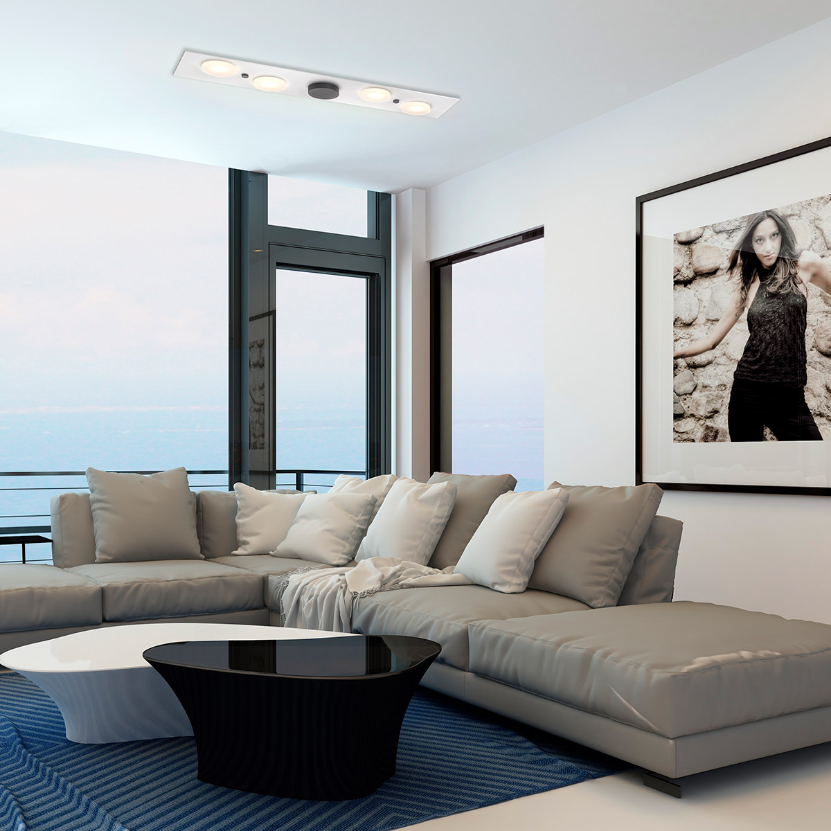 - Planets One moderne Deckenleuchte mit vier runden Lichtelementen, die auf einem flachen Baldachin versetzt angeordnet sind