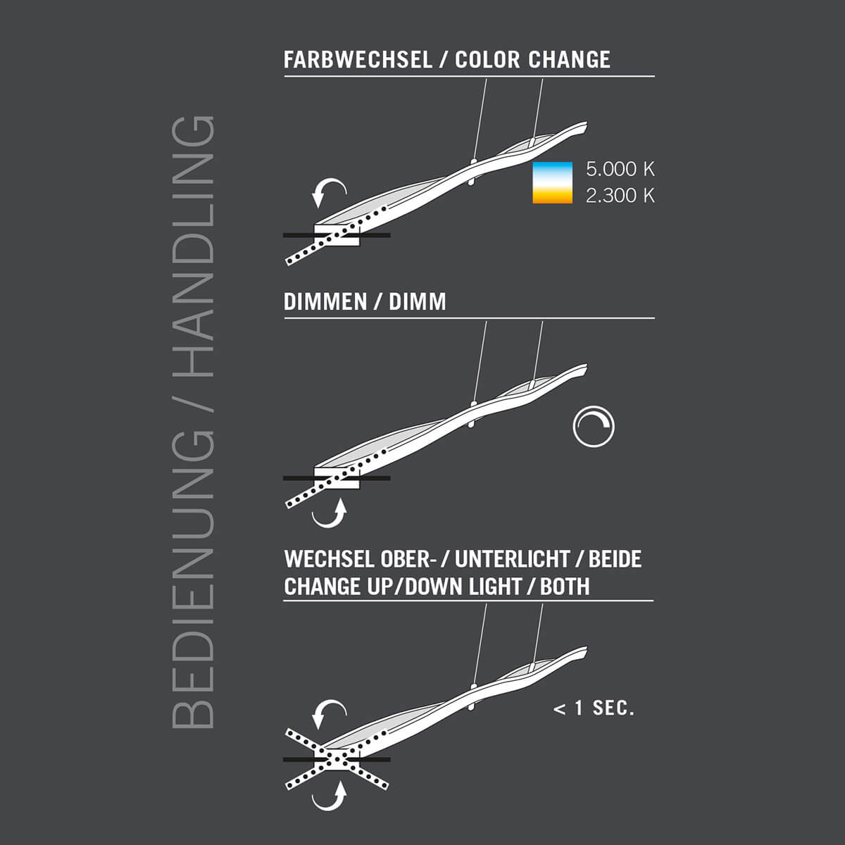 - Stufenlos dimmbar durch Kippen des Pendelelements (Vertical Control)
