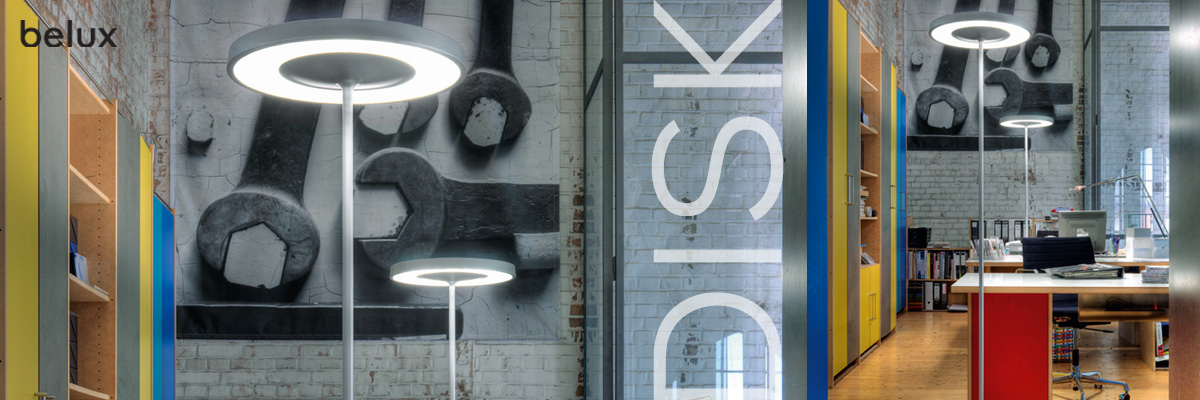 Leuchtenserie DISK, entworfen von Daniel Kübler. Diese universell einsetzbare Leuchtenserie besticht duch die Kombination aus geometrischer Klarheit und dynamischer Linienführung und setzt auf die Selbstverständlichkeit runder Formengebung. Die Leuchte ist als Pendelleuchte, Standleuchte und auch als Schreibtischleuchte erhältlich. Dank des hohen Standards entspricht sie den Minergie-Anforderungen und wurde dafür mit dem Label "Light of the Future" ausgezeichnet. Die Leuchte ist schaltbar, dimmbar und mit einer tageslichtabhängigen Sensortechnik zu bekommen. Bestellen Sie die Belux DISK Leuchtenserie bei Leuchtenland.com