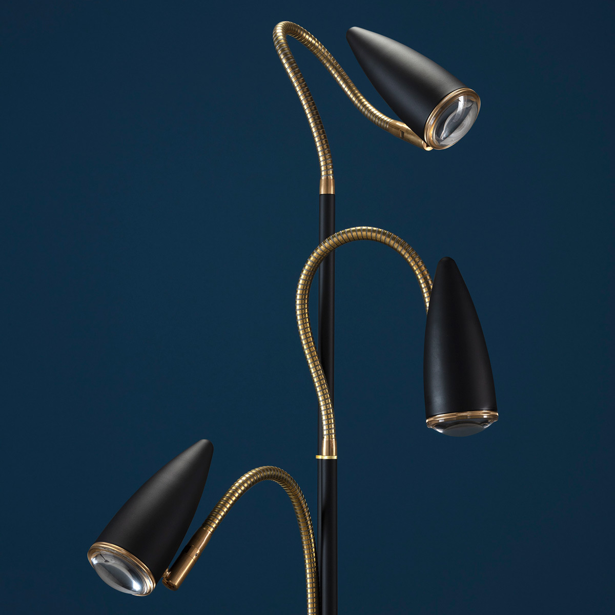 - Mit biegbaren Flexarmen aus Messing und Köpfen in Form von Scheinwerfern