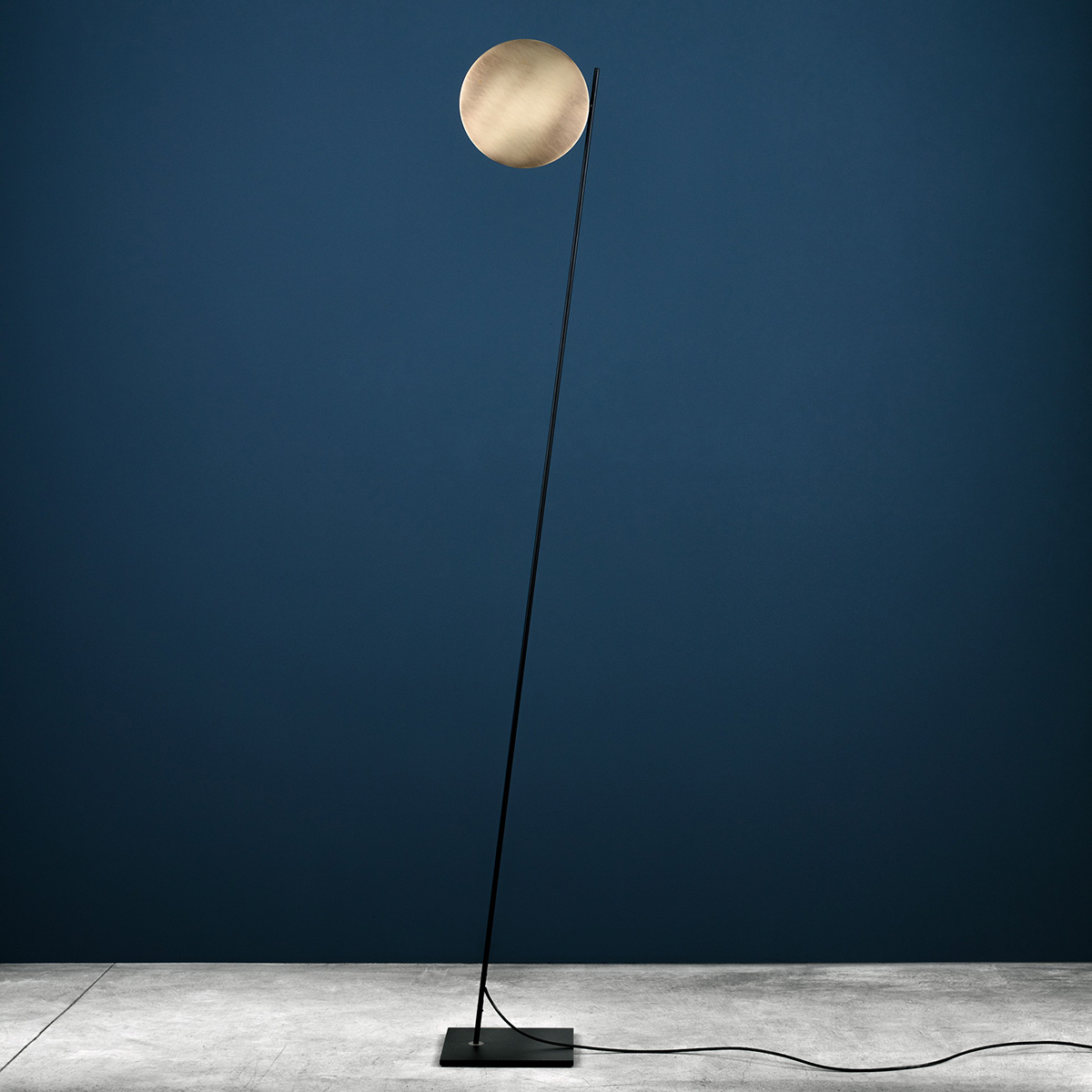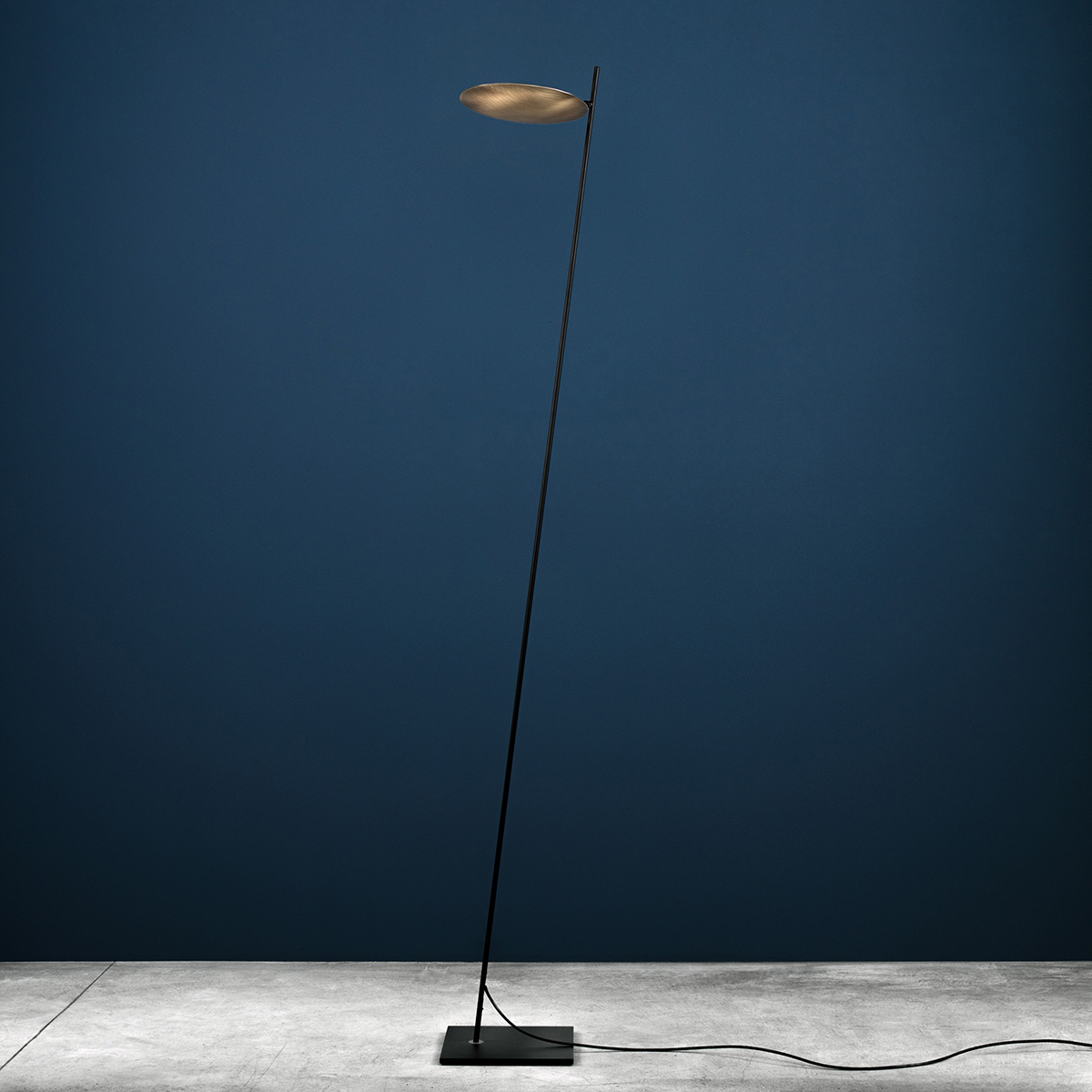 Die Catellani & Smith Lederam F0 LED Stehleuchte ist in unterschiedlichen Farbkombinationen erhältlich. Die Varianten mit einer Reflektorscheibe aus Messing oder mit Blattmetall belegtem Aluminium sind mit einem schwarz lackierten Gestell kombiniert. Bei der Version mit schwarzem Reflektor ist der Fuß schwarz, der Stab jedoch satiniert ausgeführt. Die Leuchte mit weißer Reflektorscheibe verfügt über einen weiß lackierten Fuß und ebenfalls satinierten Metallstab.