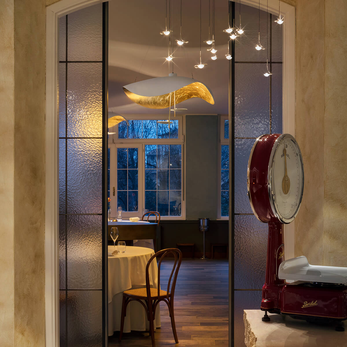 Die Lederam Manta S2 von Catellani & Smith ist in zahlreichen farblich aufeinander abgestimmten Oberflächenfinishes zu erwerben. Als Leuchtenschirm fungiert ein schwungvoll gerundeter Diffusor aus Fiberglas, der an seiner Außenseite weiß oder schwarz lackiert ist. Innen ist er wahlweise weiß lackiert oder mit Blattgold bzw. Blattkupfer belegt, wodurch das den Reflektorscheiben entströmende Licht auf strahlende Weise reflektiert wird.