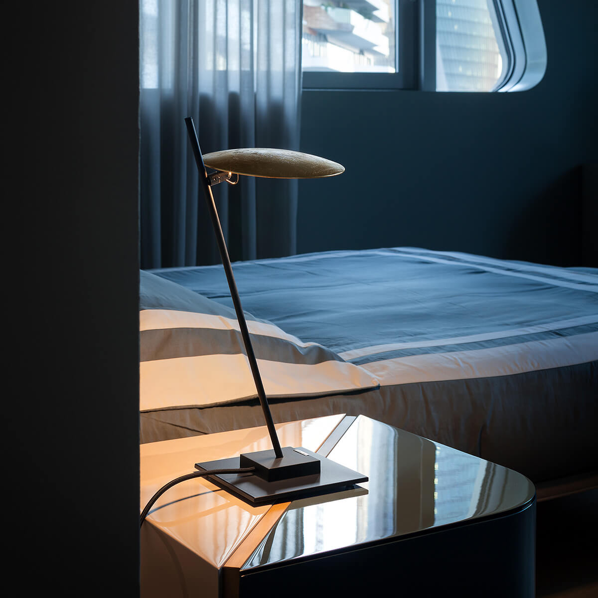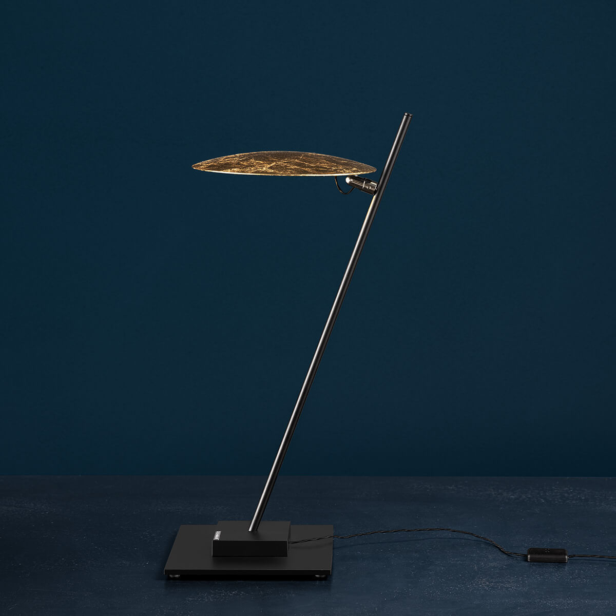 Die Catellani & Smith Lederam T1 LED Tischleuchte ist in zahlreichen farblich aufeinander abgestimmten Oberflächenkombinationen zu erwerben. Die aus Aluminium gefertigte Reflektorscheibe ist weiß, schwarz lackiert oder mit edlem Blattgold bzw. Blattkupfer belegt. Getragen wird sie von einer schmalen Stange aus satiniertem, vergoldetem oder schwarz lackiertem Metall.