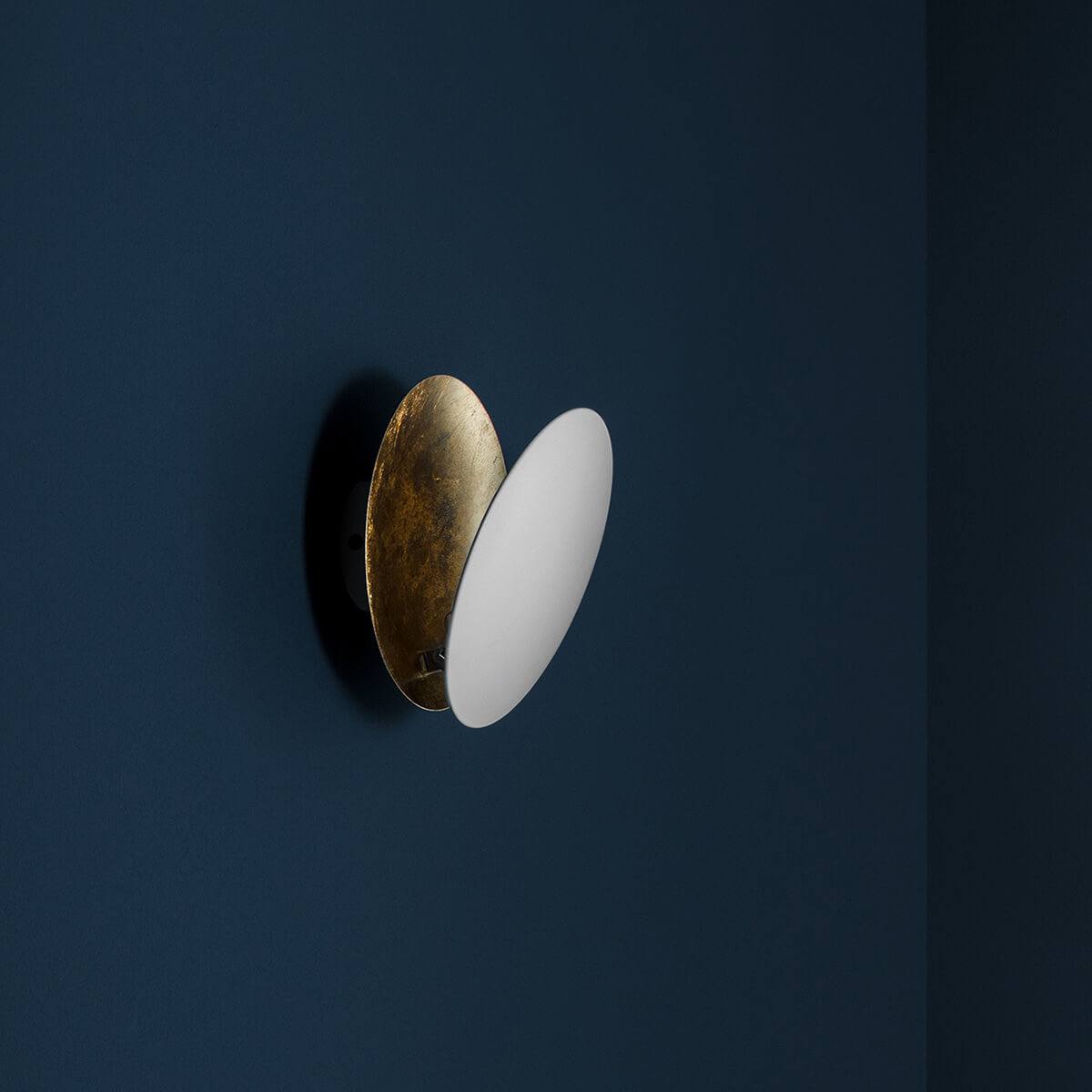 Zwei sanft gewölbte Scheiben aus Aluminium bilden den Leuchtenkörper. Die vordere Scheibe ist schwenkbar und über ein Metallgelenk mit der rückwärtigen Reflektorscheibe verbunden. Je nachdem, wie weit diese nach vorne geöffnet ist, lassen sich Schattenspiel und Wirkkreis des ausstrahlenden Lichts variieren. Ein der Lampe integriertes LED-Modul gewährleistet ein energieeffizientes, warmweißes Licht.