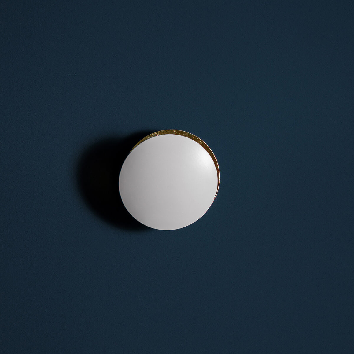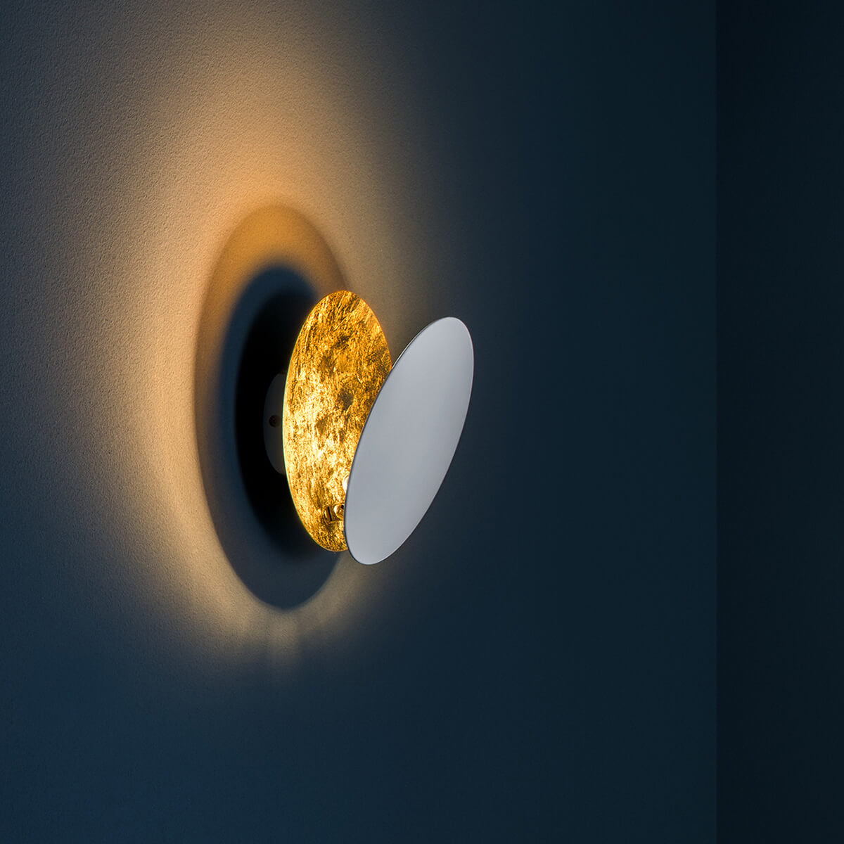 Zu erwerben ist die Catellani & Smith Lederam W 17 LED Wandleuchte in sechs verschiedenen Farbkombinationen: Bei der weißen Ausführung sind Frontscheibe und rückwärtige Reflektorscheibe innen mit Blattgold oder -kupfer belegt, was dem ausstrahlenden Licht einen warmen Schimmer verleiht. Gleiches gilt für die schwarz lackierten Wandlampen, deren Innenseiten für eine glanzvolle Lichtreflektion ebenfalls vergoldet oder in Kupfer gehalten sind.