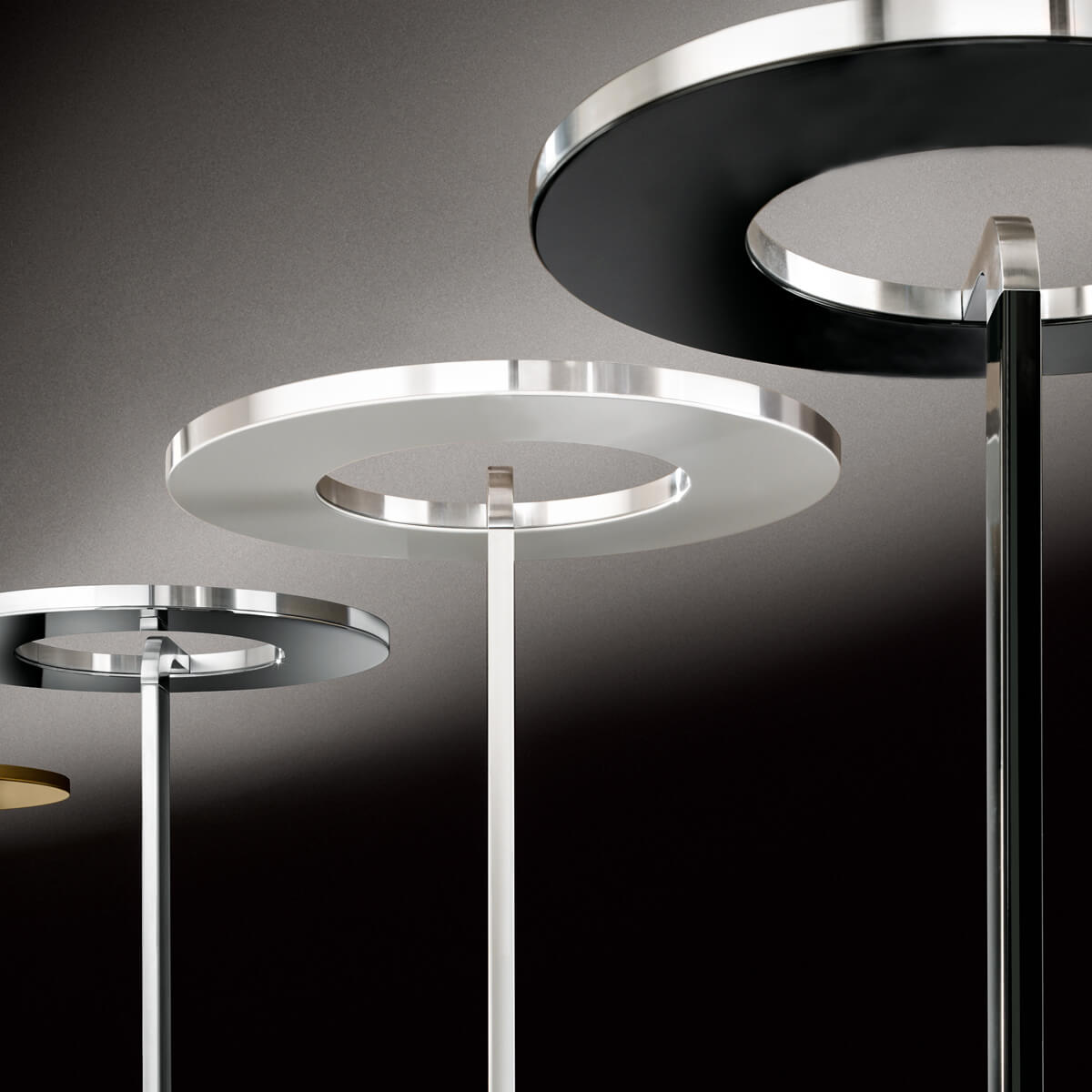 - Mit Ringen aus glanzverchromtem, goldenem oder matt emailliertem Stahl und Tragelement aus diamantgeschliffenem Aluminium