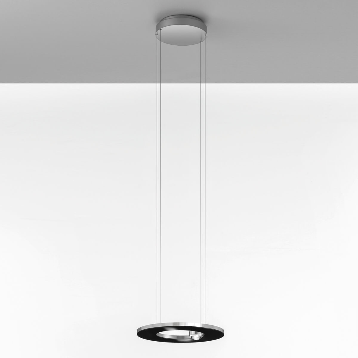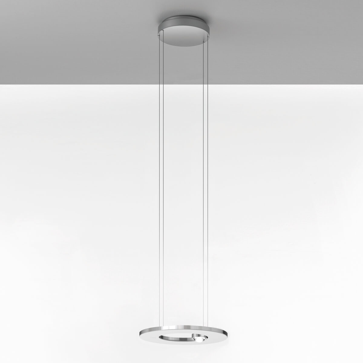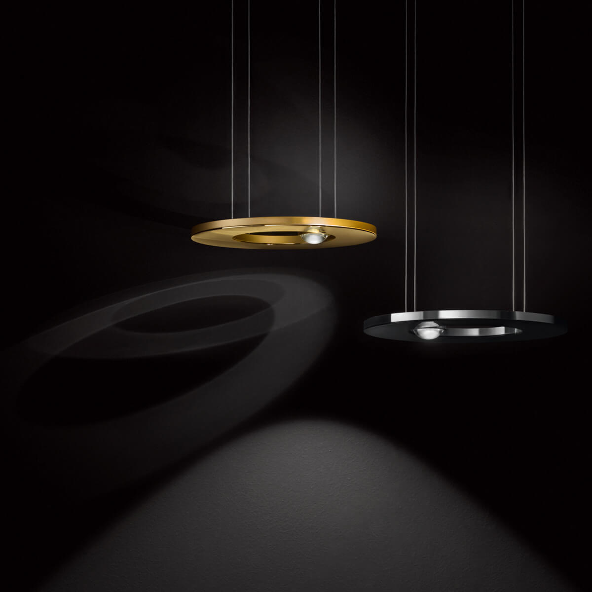 Die Hängelampe ist in verschiedenen edlen Oberflächen erhältlich, die ihr eine luxuriöse Ästhetik verleihen und jede Einrichtung aufwerten. Besonders apart wirkt der ringförmige Lampenschirm in glanzpoliertem Gold, modern und erlesen erscheinen die Versionen mit glanzvoller Verchromung oder matter Emaille-Lackierung. Für umfangreichere Beleuchtungskonzepte ist ein Baldachin zur Reiheninstallation als Zubehör erhältlich.