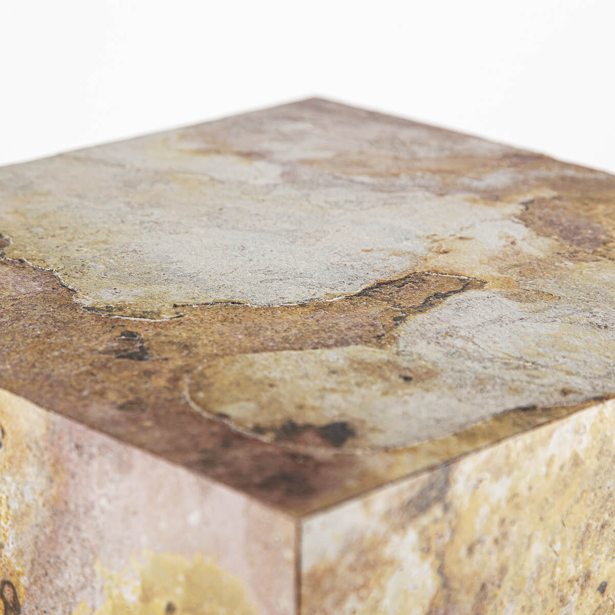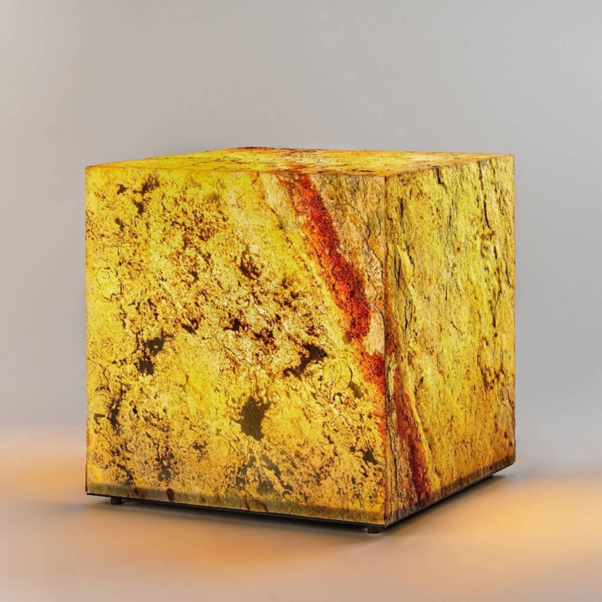 Der robuste Sockel der Lampe dient nicht nur als Grundfläche, sondern auch als Fundament für den einzigartigen Korpus aus charakteristisch strukturiertem Naturschiefer. Jeder Würfel wird behutsam geformt und in Handarbeit zur Perfektion gebracht. Die natürliche, mineralische Struktur verleiht ihm ein unverwechselbares Äußeres, auf das die Epstein Leuchtenmanufaktur besonders stolz ist. Ob beleuchtet oder unbeleuchtet, der Würfel wird zu einem Kunstwerk, das Ihren Garten zum Strahlen bringt.