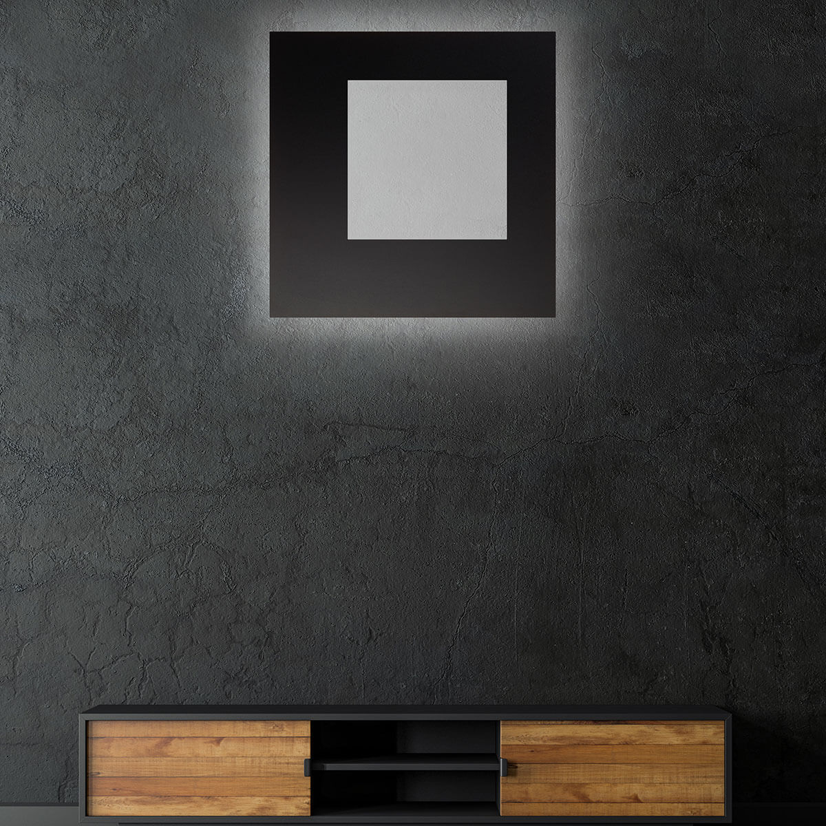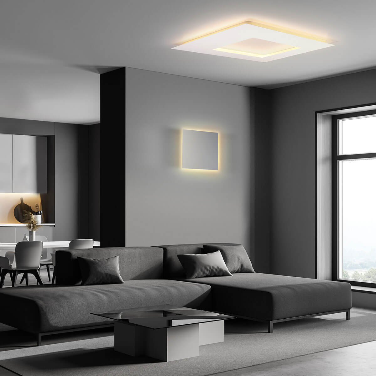 - Quadratische Wand- / Deckenleuchte mit einer versetzten Öffnung im Innern eignet sich für große Wohnräume zur allgemeinen Beleuchtung