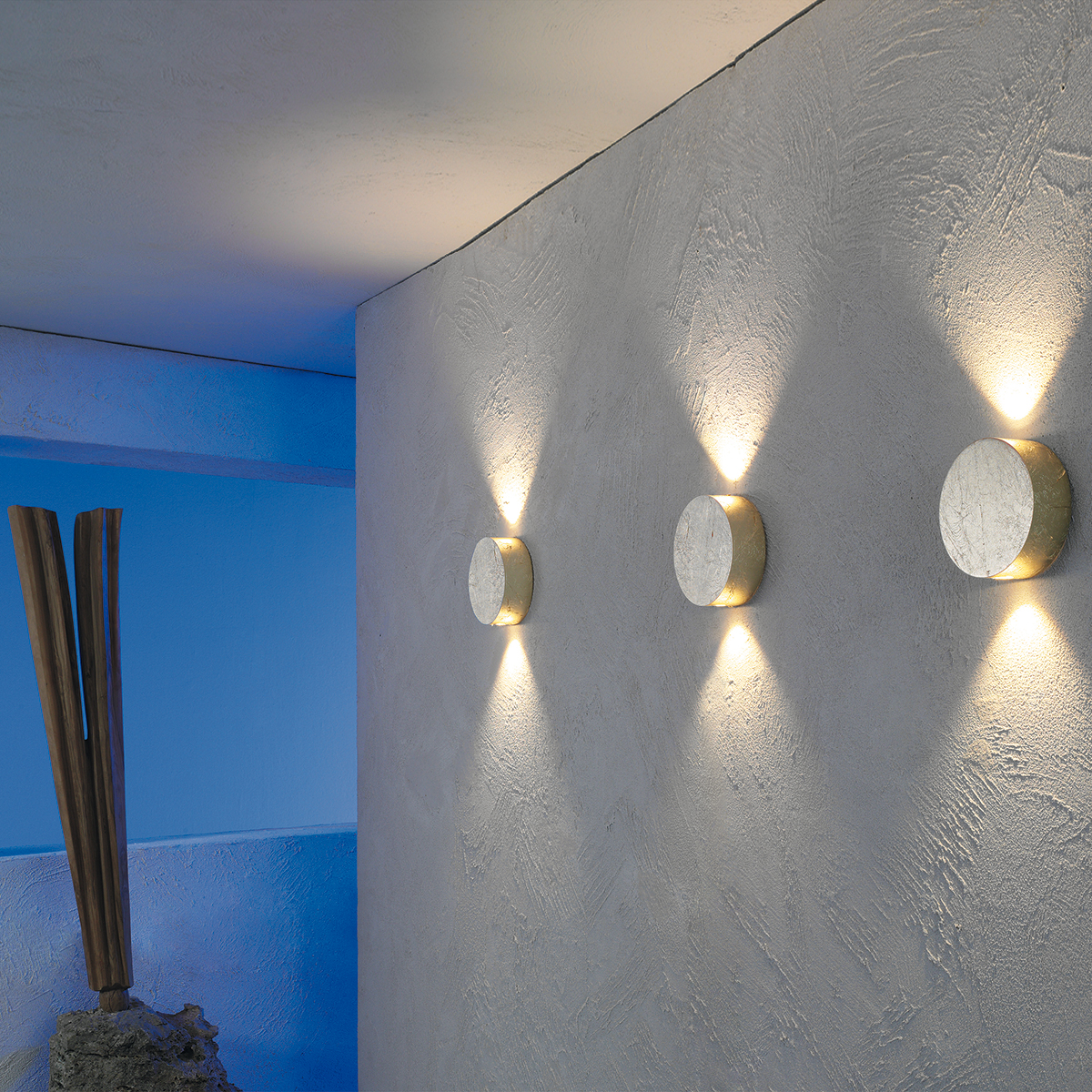 Das Design der Wandlampe ist schlicht und modern. Der Fokus liegt auf der reizvollen doppelten Lichtausstrahlung, die durch die energieeffizienten LEDs erzeugt wird und Wandflächen gekonnt akzentuiert. Die edle Blattgoldauflage unterstreicht die elegante, stilvolle Ästhetik.