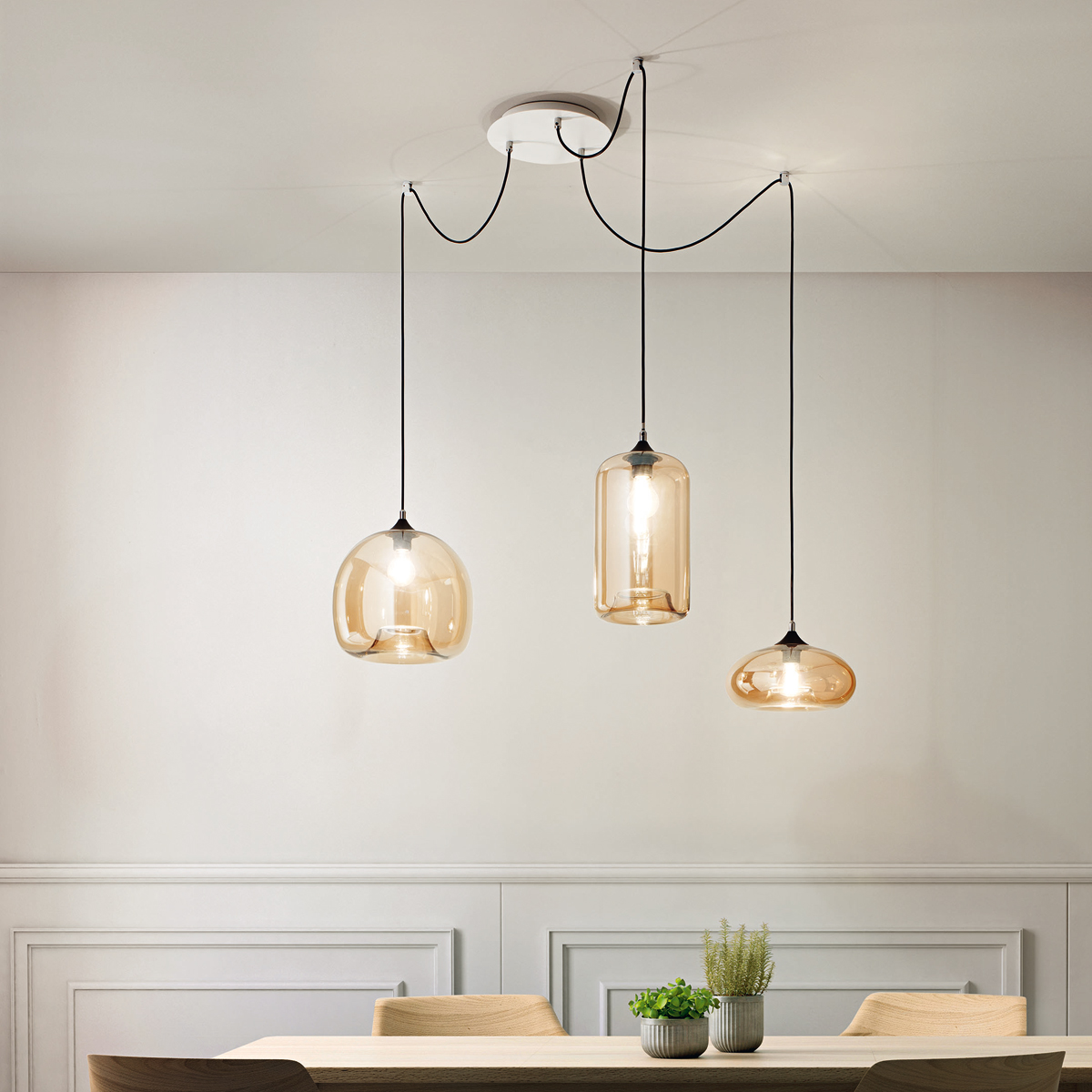 Die Lampenschirme der Fiona Pendelleuchte bestehen aus reinem, mundgeblasenem Glas. Kleine ästhetische Unregelmäßigkeiten wie vereinzelte Bläschen sind daher kein Qualitätsmangel, sondern der Beweis dafür, dass jede Leuchte in Handarbeit hergestellt wird. Im Ergebnis kann es dazu führen, dass eine Seite des Glases schwerer ist als die andere und das Glas nicht gerade hängt. Um den Schirm entsprechend zu justieren, bitten wir Sie den Abstand zwischen Fassung und Glasloch zu verwenden.
