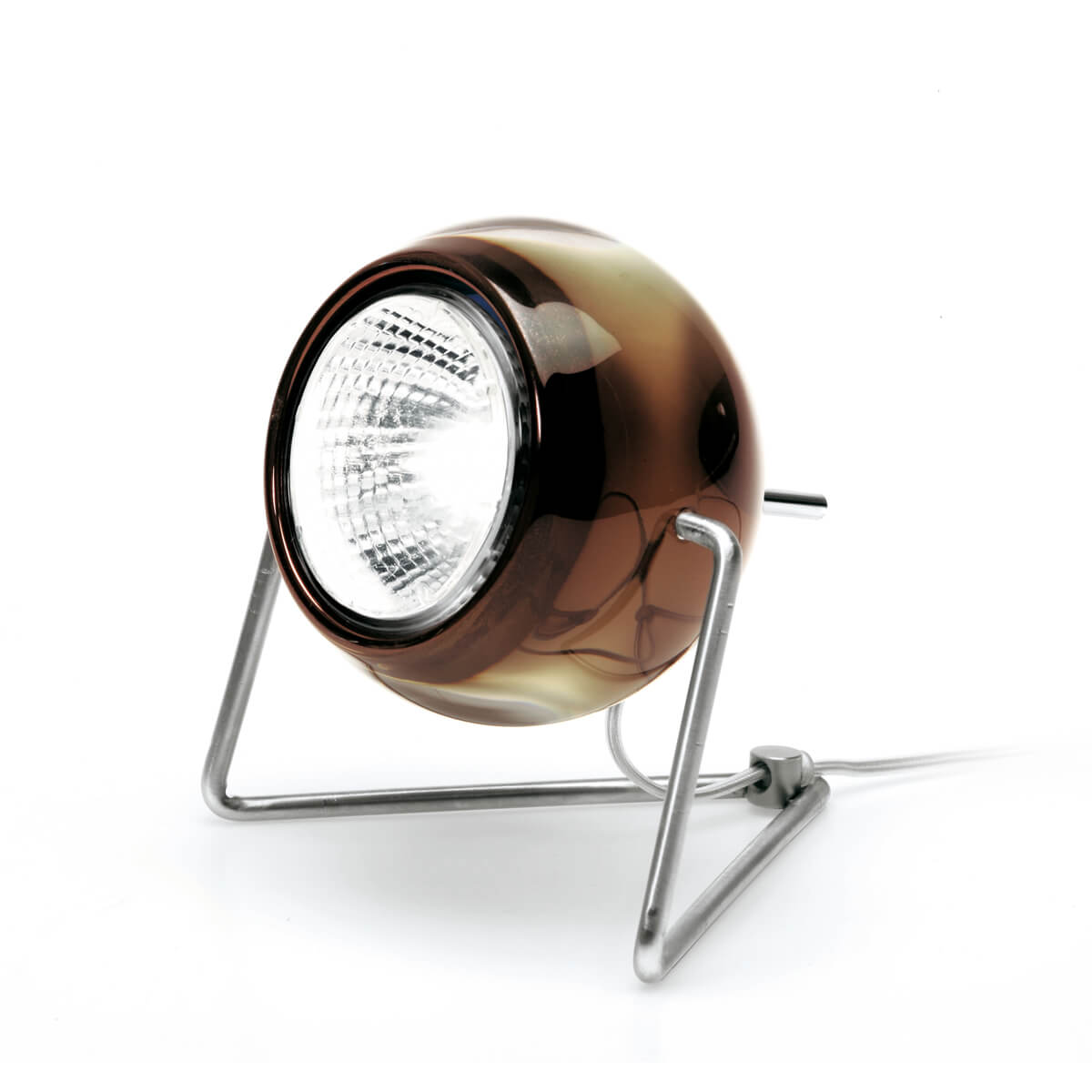 Im Mittelpunkt des Designs steht der kugelförmige Strahlerkopf aus 24 % Bleikristallglas, der sich um bis zu 360° drehen lässt. So lässt sich das Licht gezielt ausrichten – etwa als Akzentbeleuchtung auf einem Sideboard, als Leselicht auf dem Nachttisch oder zur gezielten Aufhellung dekorativer Objekte im Raum. Der grazile, glänzend verchromte Fuß verleiht der Leuchte optische Leichtigkeit und formale Eleganz.