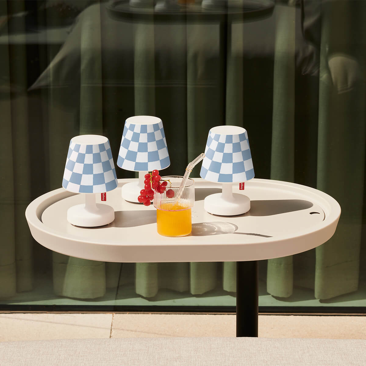 Das Edison the Mini LED Akkuleuchten-Set von Fatboy vereint stilvolle Beleuchtung und individuelles Design in einem praktischen 3er-Set. Jede der kompakten, kabellosen Tischleuchten wird mit einem passenden Mini Cappie Set Wave Ground geliefert. Die blau-weißen Schachbrettmuster der Cappies verleihen den Lampen einen modernen und freundlichen Look, der sich perfekt in jedes Interieur einfügt.