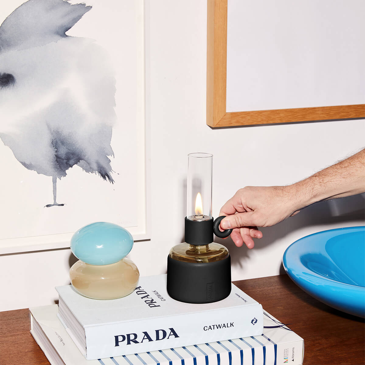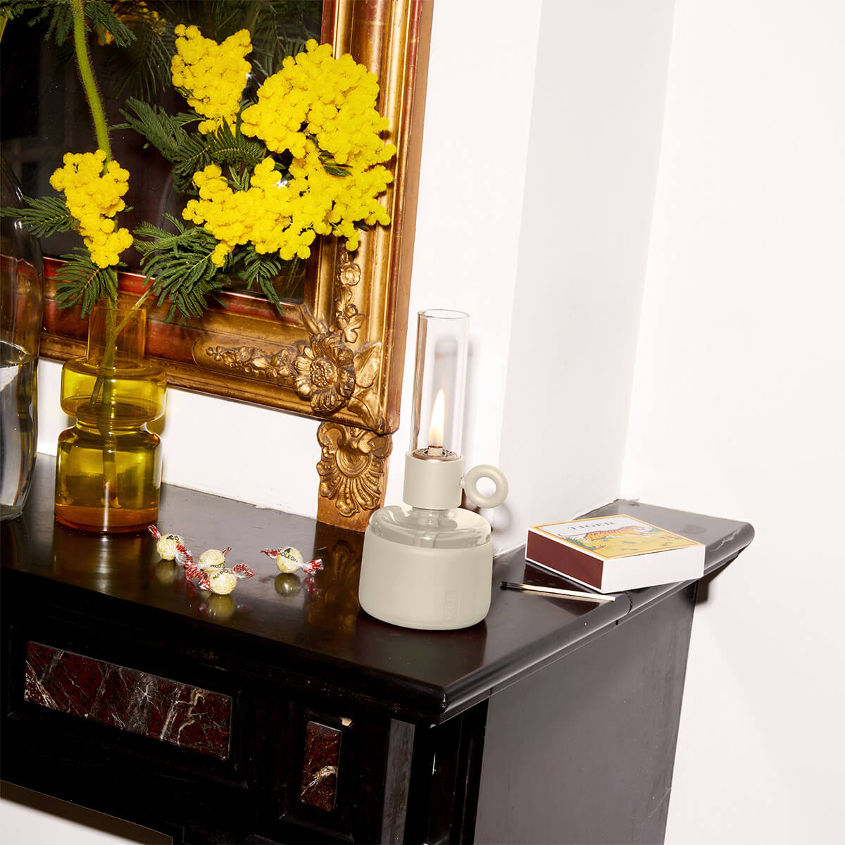 Ausgestattet mit einem Baumwolldocht, brennt die Flamtastique XS mit Lampenöl. Als Brennstoffe eignen sich Öle auf Paraffin- oder Kerosinbasis (gereinigt), wodurch sich eine flexible und einfache Handhabung ergibt. Durch den transparenten Teil des Lampensockels lässt sich der Ölstand jederzeit leicht einsehen, und die matte Silikonbeschichtung verleiht dem Glas zusätzliche Stabilität. Über die große Öse kann der Docht problemlos justiert werden, um die Flammengröße an Ihre Wünsche anzupassen.