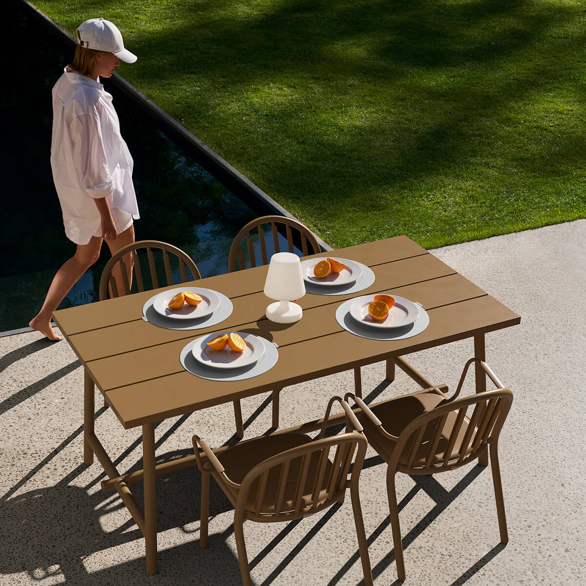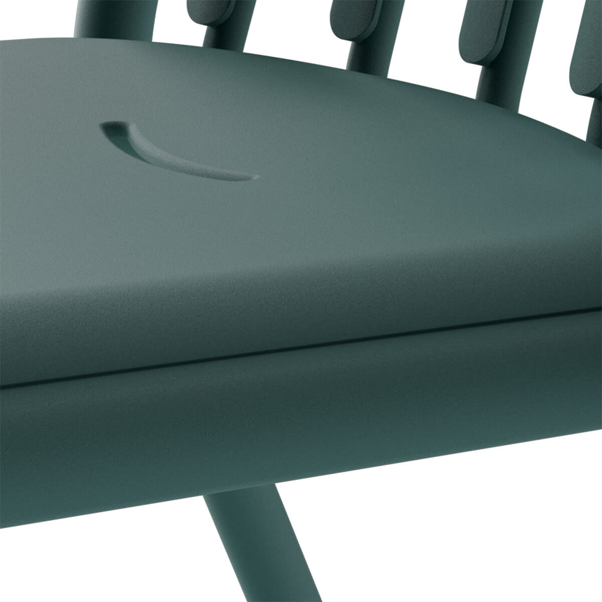 Auch in den Details zeigt sich, wie durchdacht das Design ist. Die Armlehnen und die Streben im Rückenbereich sind abgeflacht, was den Komfort zusätzlich erhöht und die angenehme Haptik unterstreicht. Ein kleines, aber praktisches Detail ist die Öffnung in der Sitzfläche in Form eines dezenten Lächelns. Sie lässt Regenwasser schnell ablaufen, sodass der Gartenstuhl nach einem Schauer rasch wieder trocken und einsatzbereit ist. So wird der Alltag im Außenbereich unkomplizierter und entspannter.