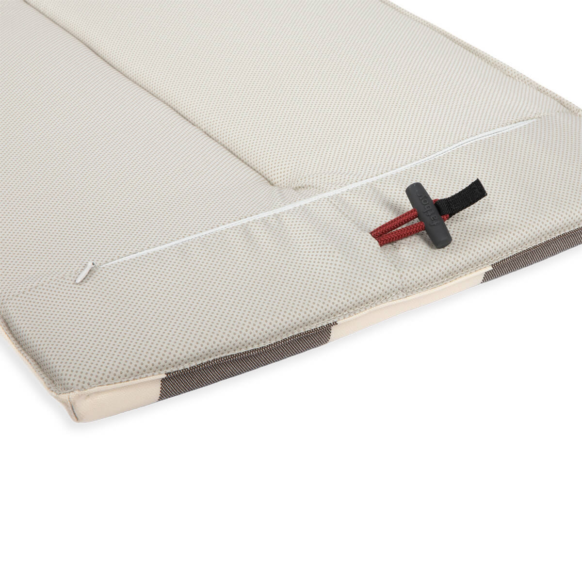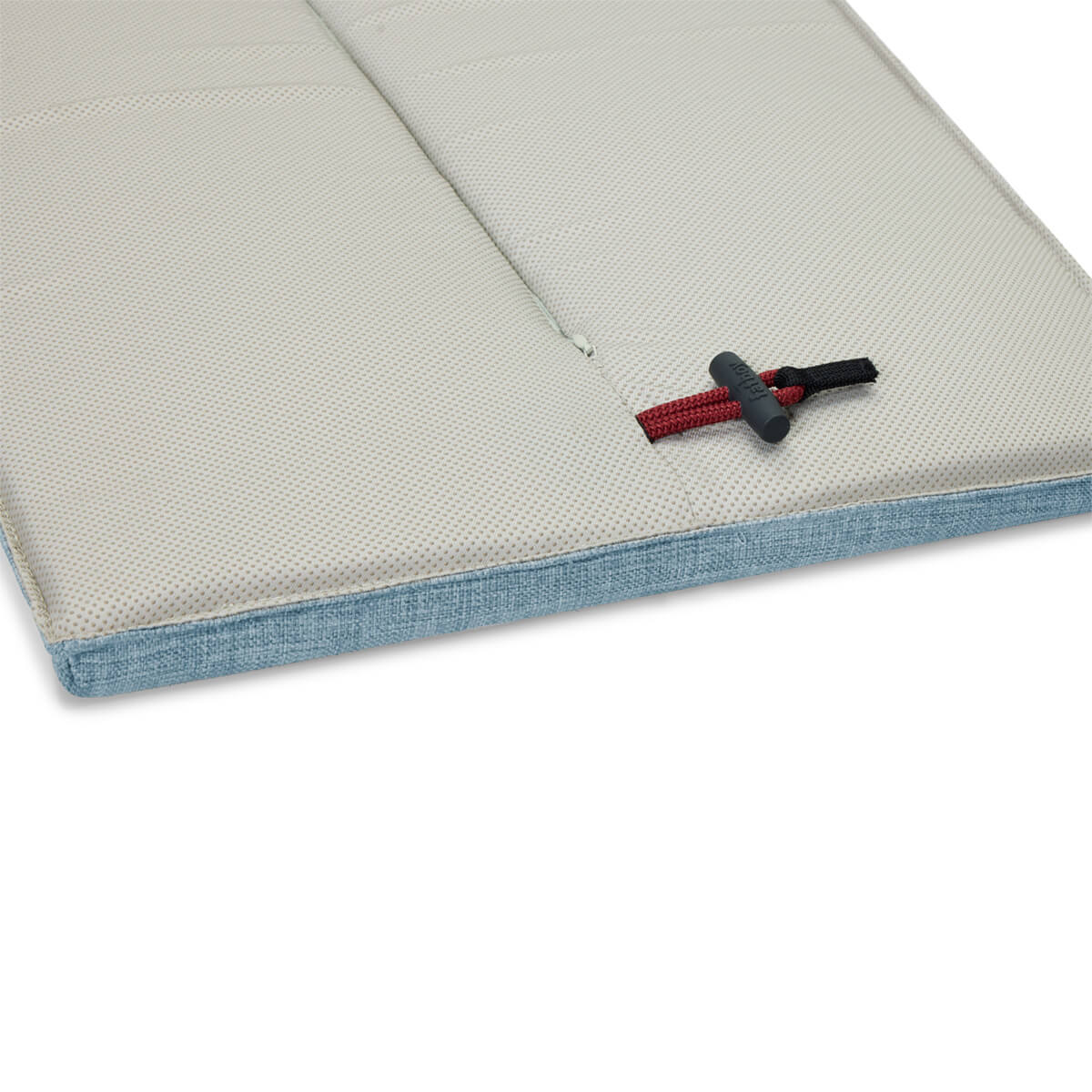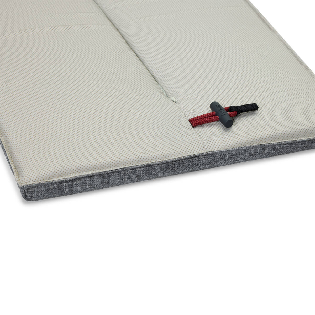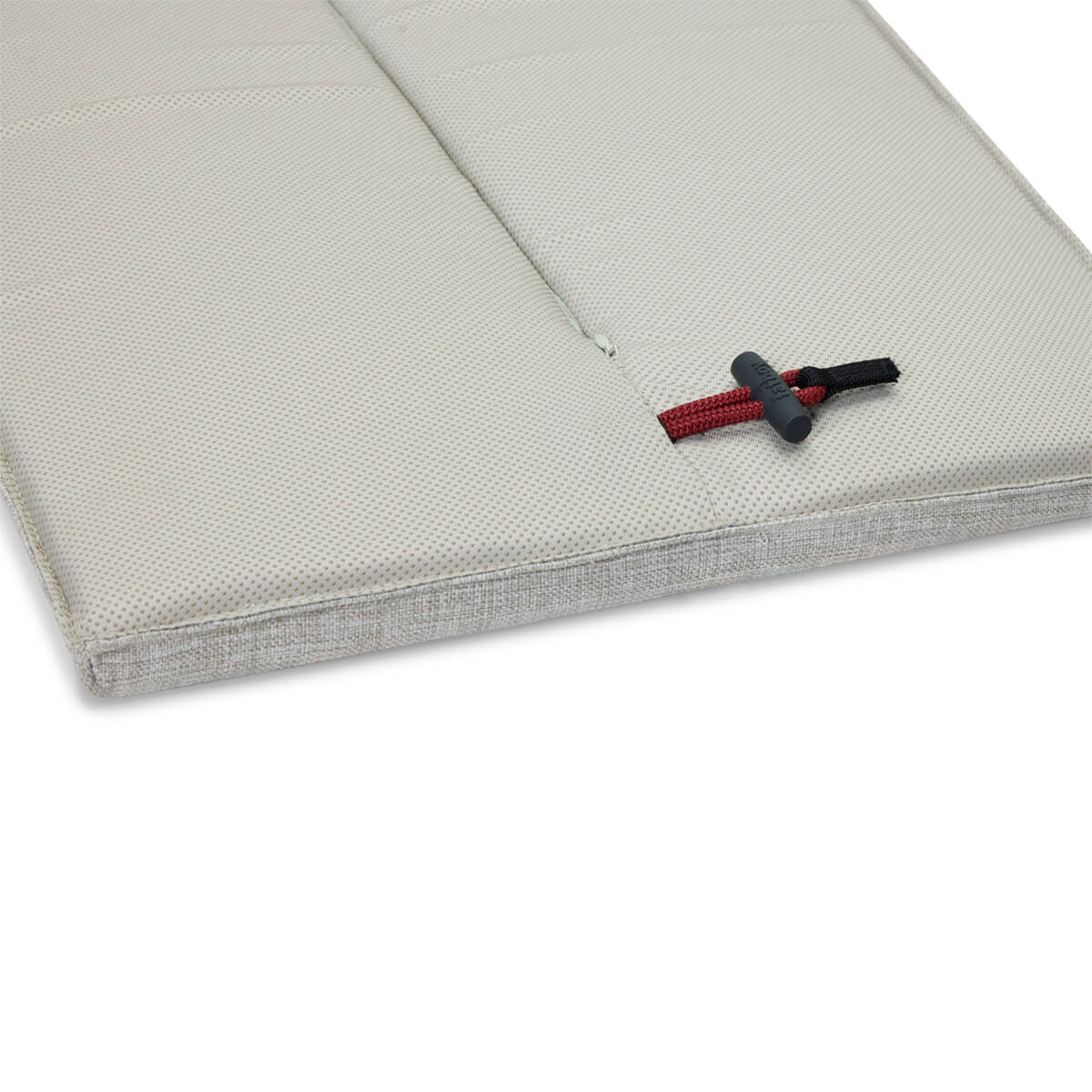 Auch die Befestigung ist angenehm unkompliziert gelöst. Das integrierte Bändchen unter dem Sitzkissen wird einfach zwischen die Latten der Bank geführt und sorgt dafür, dass es sicher an seinem Platz bleibt. Ergänzt wird dies durch eine rutschfeste Unterseite, die zusätzlichen Halt bietet. So sitzt das Kissen zuverlässig, selbst wenn die Bank oft genutzt und verschoben wird.
